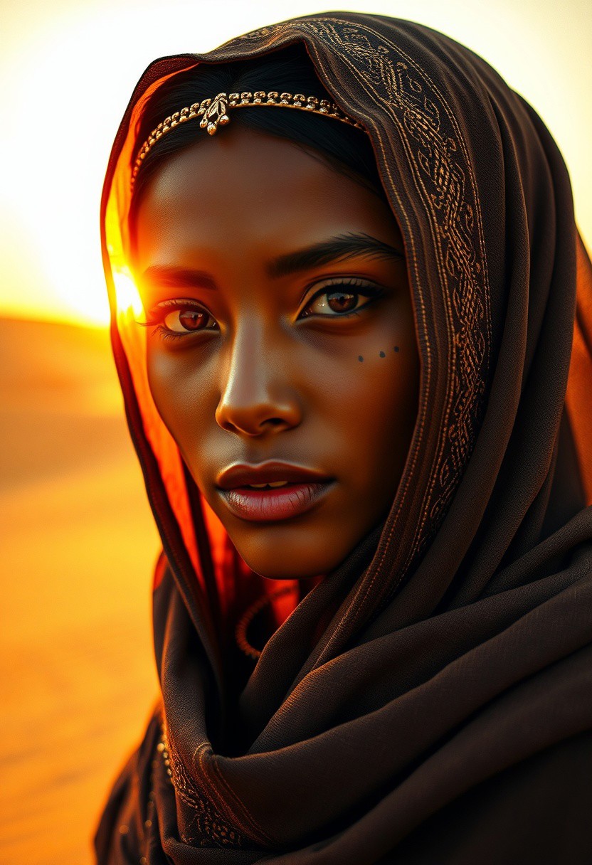 analog film photo A mesmerizing portrait capturing the essence of timeless beautyaa young Arabic woman with delicate, intricate dark tribal face paint, adorned in traditional attire y. Her deep, soulful eyes gleam with wisdom and warmth. The soft, golden sunlight bathes her face, casting a warm glow that accentuates her gentle features and the delicate details of her attire, which is woven with glimmering threads Behind her stretches a vast, serene desert landscape, where endless sand dunes meet a sky ablaze with a breathtaking sunsetaa blend of fiery orange, soft lavender, and deep indigo. Small, ethereal wisps of sand swirl in the warm breeze, capturing the beauty and magic of her world. This intimate yet powerful scene conveys both the strength and grace of an ancient culture, capturing the viewer in a timeless, heart-stopping moment of beauty, tradition, and wonder, score_9, score_8_up, very detailed, detailed eyes, high detailed texture, realistic, photorealistic, perfect eyes, real life realistic, Expressiveh, Cinematic Film, detailed background, dynamic angle, beautiful