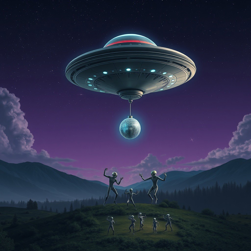 detailed, high resolution, 4k, UFO, alien space ship, a UFO is hovering in sky, night, clouds, dark purple sky, stars, big stars, small stars, nebula, UFO is glowing blue slightly, UFO is dangling a disco ball, disco ball hanging from under the UFO, disco ball is attached by a rope, disco lights, forest, mountains, forest clearing, a bunch of aliens are dancing in the forest clearing, the aliens are having a dance party, aliens are break dancing, dynamic poses, dynamic dance moves, birds eye view, view from above,