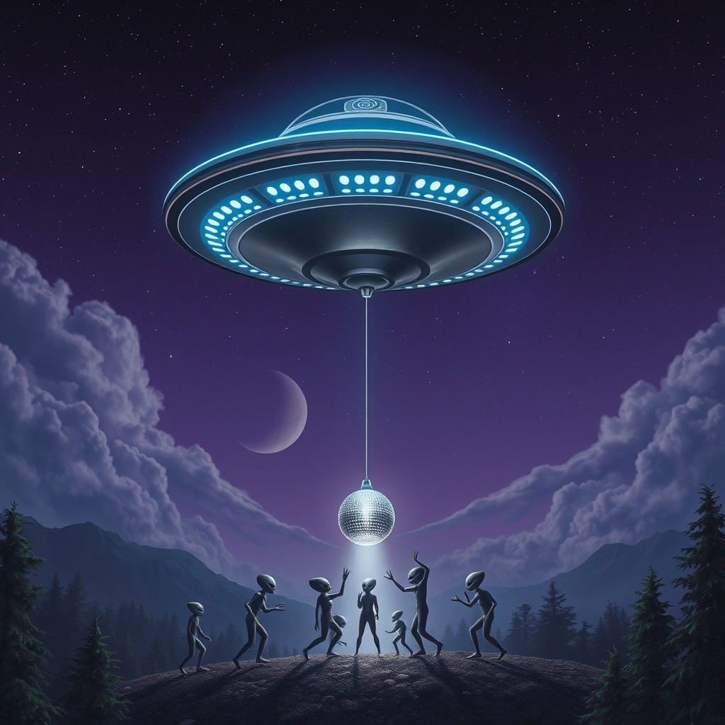 detailed, high resolution, 4k, UFO, alien space ship, a UFO is hovering in sky, night, clouds, dark purple sky, stars, big stars, small stars, nebula, UFO is glowing blue slightly, UFO is dangling a disco ball, disco ball hanging from under the UFO, disco ball is attached by a rope, disco lights, forest, mountains, forest clearing, a bunch of aliens are dancing in the forest clearing, the aliens are having a dance party, aliens are break dancing, dynamic poses, dynamic dance moves, birds eye view, view from above,
