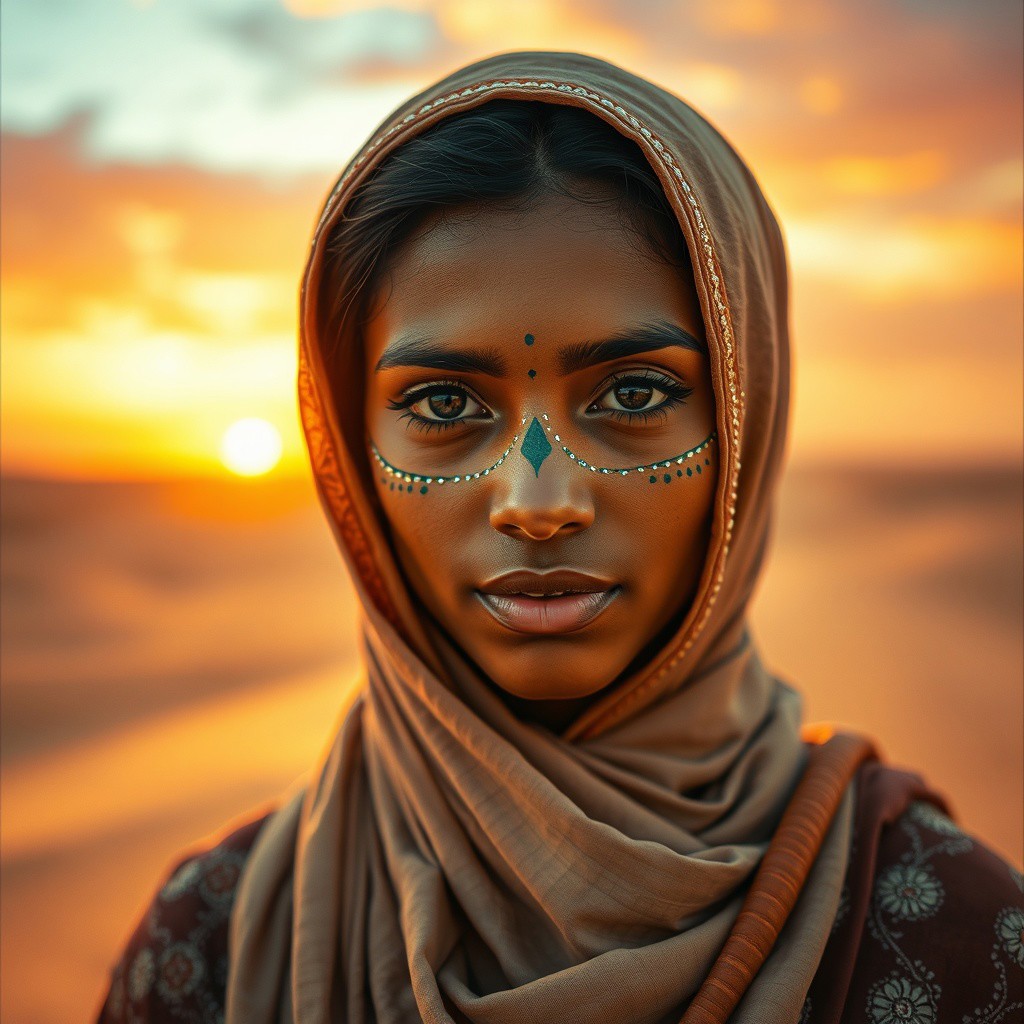 analog film photo A mesmerizing portrait capturing the essence of timeless beautyaa young Arabic woman with delicate, intricate dark tribal face paint, adorned in traditional attire y. Her deep, soulful eyes gleam with wisdom and warmth. The soft, golden sunlight bathes her face, casting a warm glow that accentuates her gentle features and the delicate details of her attire, which is woven with glimmering threads Behind her stretches a vast, serene desert landscape, where endless sand dunes meet a sky ablaze with a breathtaking sunsetaa blend of fiery orange, soft lavender, and deep indigo. Small, ethereal wisps of sand swirl in the warm breeze, capturing the beauty and magic of her world. This intimate yet powerful scene conveys both the strength and grace of an ancient culture, capturing the viewer in a timeless, heart-stopping moment of beauty, tradition, and wonder, score_9, score_8_up, very detailed, detailed eyes, high detailed texture, realistic, photorealistic, perfect eyes, real life realistic, Expressiveh, Cinematic Film, detailed background, dynamic angle, beautiful