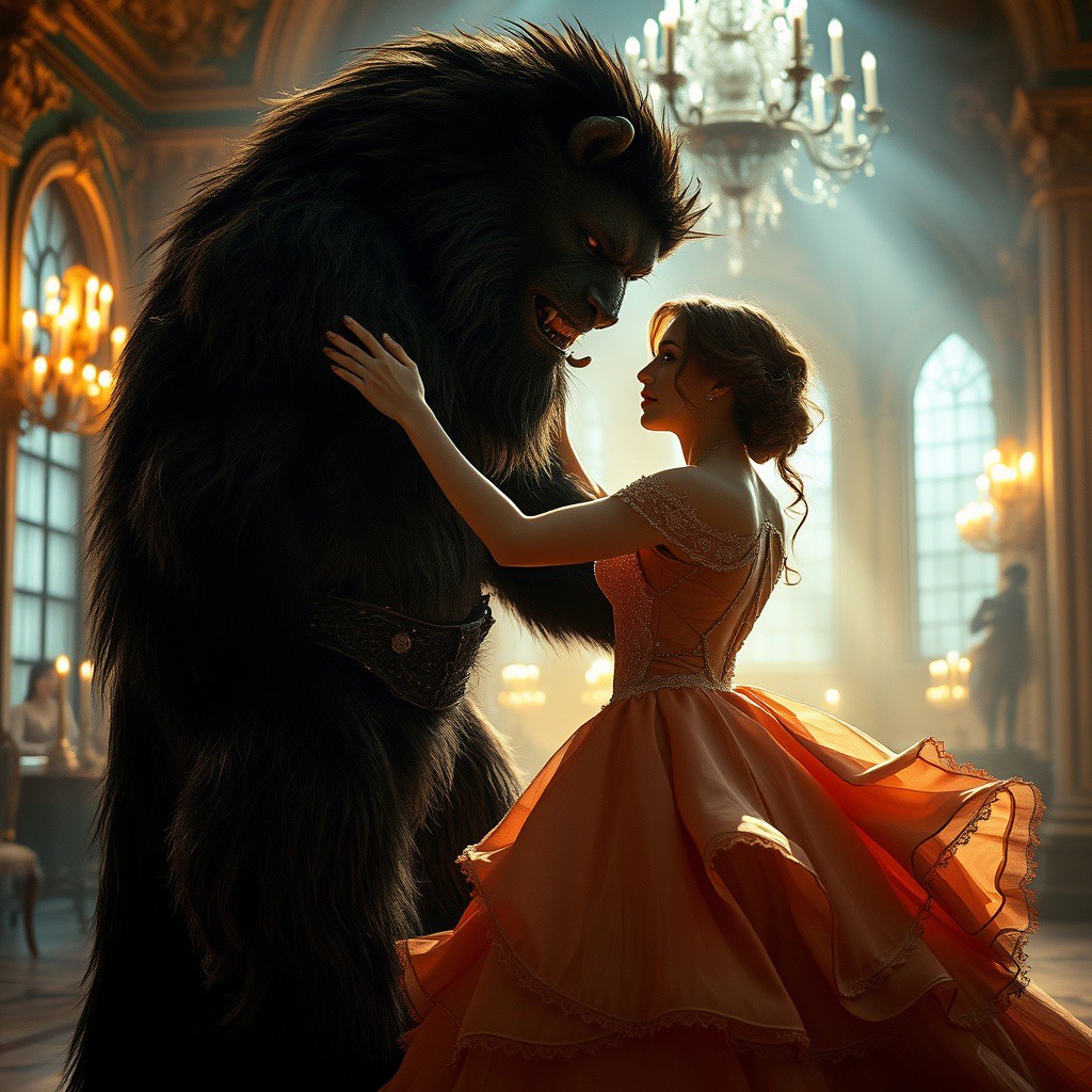 urban-fantasy Angel high-fashion stylish romance novel, photorealistic, masterpiece, best quality, detailed, full-length, full-body cinematic, dynamic lighting, soft shadow, epic detailed indoor lavish castle landscape background, professional photography, depth of field, intricate, detailed Silken shadows dance, at Venice ball: a sexy sultry most beautiful 18yo woman on earth in an off-shoulder cleavage-baring ballgown is dancing with a towering muscular handsome fearsome powerful furred massive giant tall beast, fairytale, paranormal, fantasy, breathtaking couple, background at a distance is an elegant ball room, beauty and beast, Labyrinth, Jareth and Sarah, dreamlike, surrealism, sharp focus, studio photo, intricate details, highly detailed, decadence. fog, a masterpiece, award winning, iridescent, gold, bright, pastels, candles, chandelier, marble, Disney's Beast, Belle, Beauty-and-the-beast, Disney