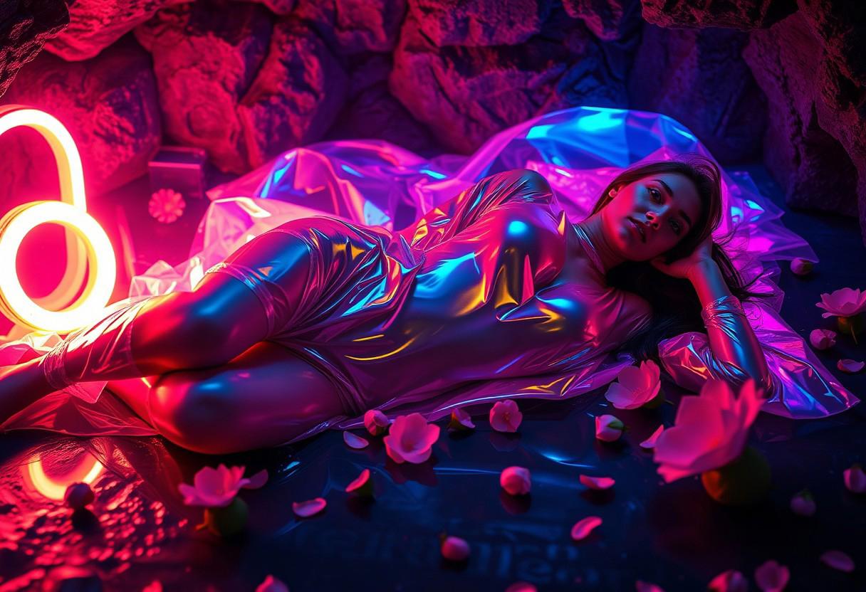 Composition of a surreal render, displayed in an athlete-figurative theme. It highlights a fully clothed figure that includes a woman completely enveloped in holographic fabrics. Neon illumination accentuates dimly lit forms. This intense image captures an ephemeral, lively temperament, with skin-tight clothing covering her entire figure and head, showcasing an attractive pose of a charming young woman lying relaxed, with the all-covering fabric subtly accentuating her bodily features. Only the strands of her hair reveal a glimpse of her identity. Flowers and freely placed gemstones reflect the moment, enhancing the sensations. Ecstatic and sharp-angled view captures intensity, with the ambiance illuminated by a colorful glow of cave lights. The reflective thin waist accentuates her hips and thighs, creating an appealing yet timid appearance. A skin-tight holographic robe clings to her skin, imparting a sense of tamed passion. This studio shot conveys feelings of allure within a lush environment where the figure lies, blending figurative details with magical realism and true-expressed textures. The moderate accents showcase where the natural meets a futuristic environment, enhancing the design of the surroundings. In this way, the image reveals the woman, while her complete clothing is clearly intentional for this theme. The holographic attire is central, reflecting the surroundings, which is vital for experiencing the ambiance and enhancing the mystery of the figure.