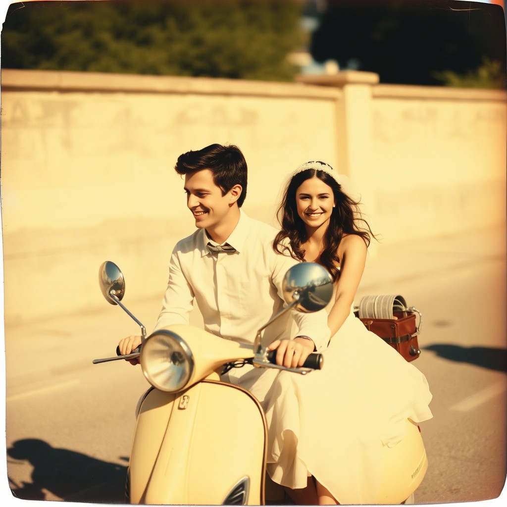 1970 polaroid photo poorly focused sepia an italian young couple just married happy riding in a vespa wedding dress sunny day