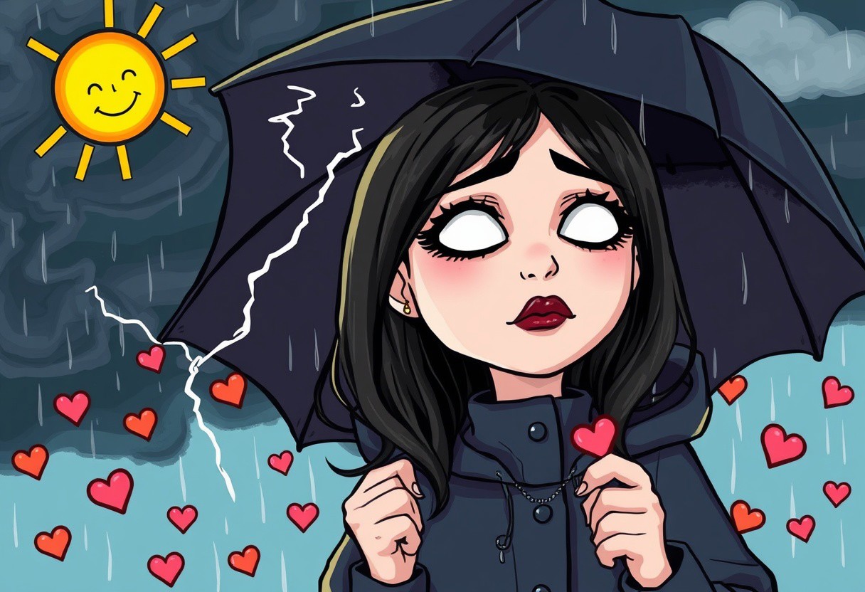cartoon style, a 18 years old woman goth makeup sad with a raincoat and a black umbrella a black storm with thunder insisde the umbrella a sunny day with a sun with a smile and many small red hearth shaped candies falling from sky