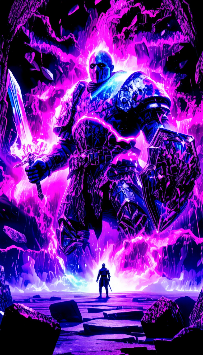 solo, score_9, score_8_up, score_7_up, score_6_up, hd, stunning scenario, realistic, wide angle, full body shot. A wide shot of a bulky ice giant, square jaw, masculine traits, blue skin with a full set of (crystal armour). He have a magic sword and shield. The light effects from the spell reflect off his armor and the surrounding ruins, intensifying the arcane spectacle. The contrast between the purple and blue sets the scene. A small knight stand in front of the giant. Bosstyle, aidmafluxpro1.1, auralora, DB4RZ, DB4RZ style painting embedding:badhandv4.pt embedding:easynegative.safetensors
