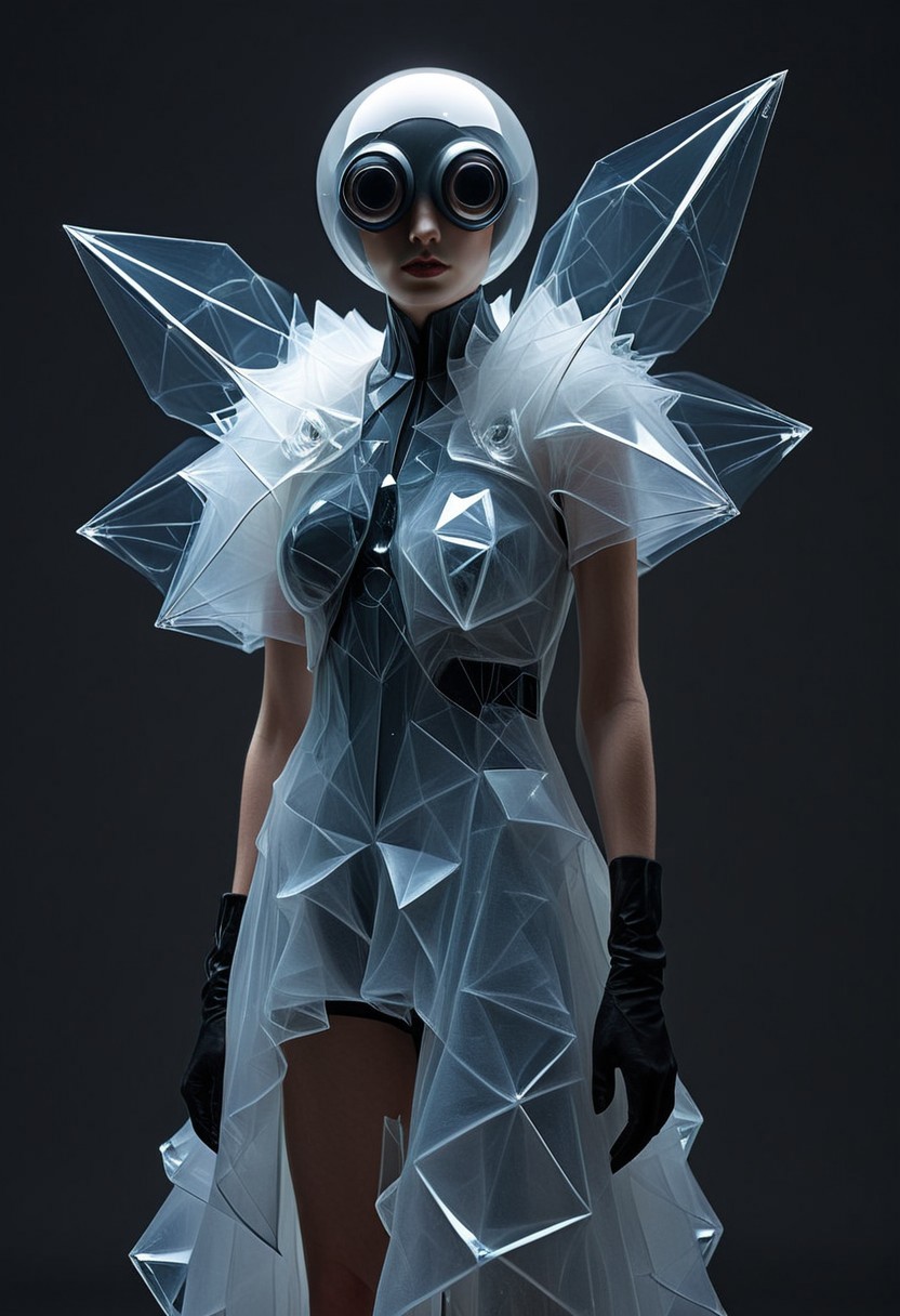 rp_slgd, (masterpiece, best quality), googly eyes, avant-garde fashion, deconstruction, geometric forms, unconventional materials, Japanese minimalism, asymmetry, futuristic textiles, sculptural garments, technology in fashion, structural elements, Comme des Garçons collaborations. surreal geometric light structures, misty ethereal atmosphere, soft interplay of shadow and light, timeless wilderness with abstract modern infusion
