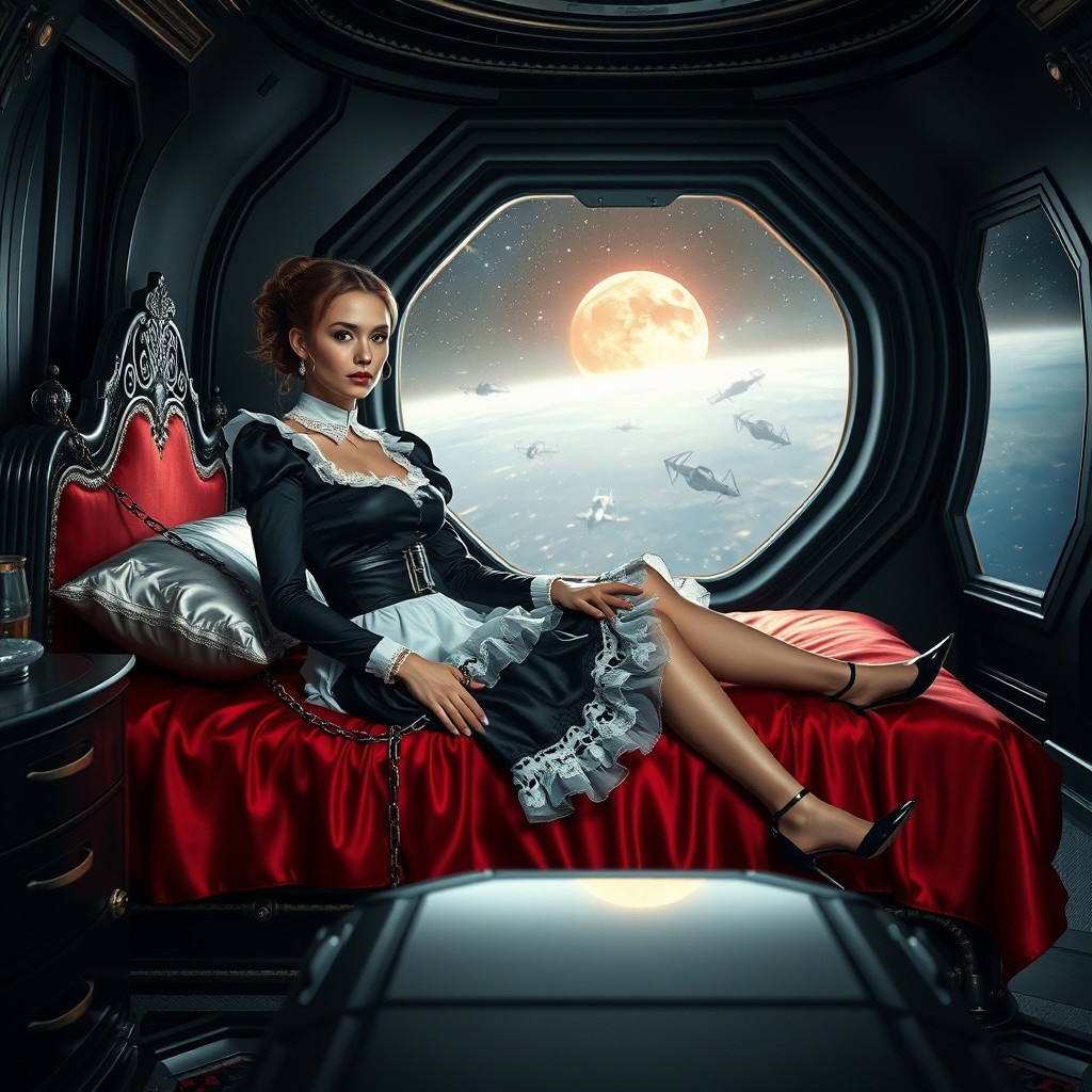 Regally poised norvegian alluring aroused rich sweet princess ball gagged, elegant slave collar, whorish hot stunning french maid glossy black satin uniform with white transparent lace details and very short skirt, white lace apron, lush puffy white tulle petticoat, black lace garter belt and tan silk stockings, glossy ankle strap high heels, sitting serenely on a sumptuous, dark red satin bed in the opulent black cabin of an imperial spaceship. The bed, adorned with intricate, polished metal accents and foil pillows, is situated near a massive observation porthole, offering a breathtaking vista of the stars, a glowing moon, and sleek TIE fighters soaring through the void. Thin, gleaming chains bind the lady to the bed, while soft, ethereal lighting illuminates the scene, blending the elegance of Gustav Klimt, the luxury of Albert Moore, and the futuristic vision of Syd Mead.