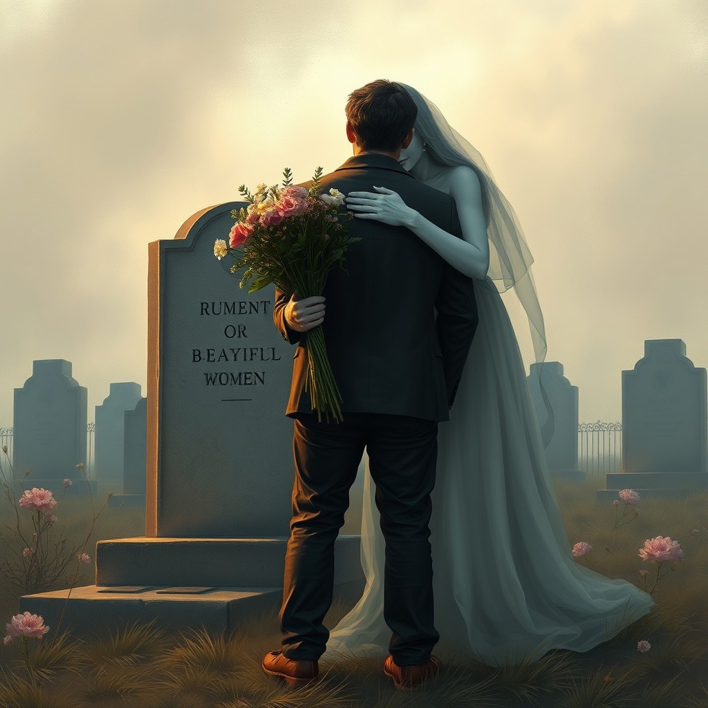 realistic, good definition, a sad man standing holding a bunch of flowers watching a tombstone while the ghost of the beautiful smiling woman is hugging him