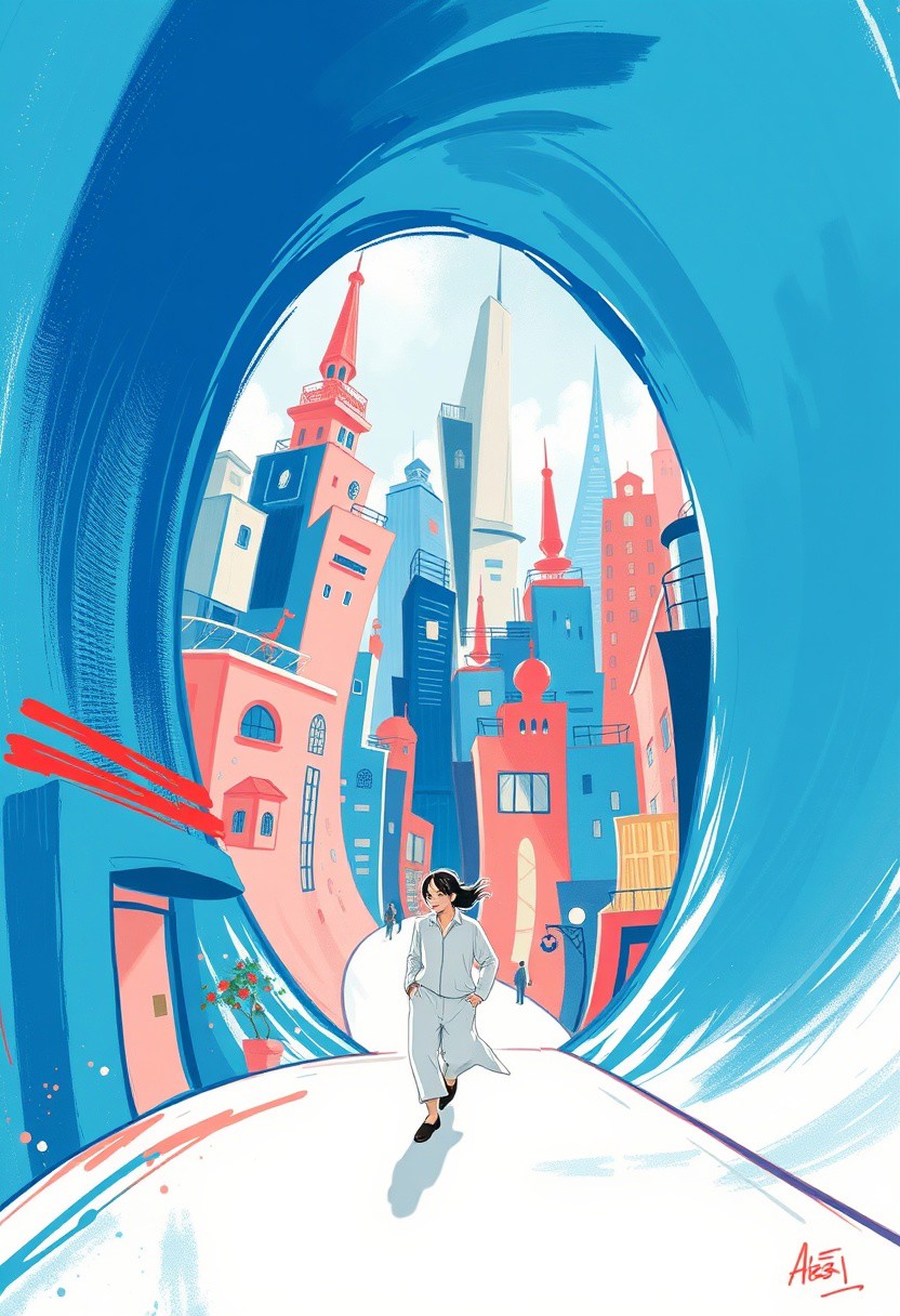 A vibrant, swirling cityscape, where expressive brushstrokes and bold figures move through curved, surreal architecture., white attire, comic illustration style, blue, light red, and white background, beautiful composition, harmonious and serene atmosphere, subtle smile, expressive linework, soft shading, balanced color palette, gentle contrast, warm and inviting mood, minimalistic yet detailed, storytelling elements, elegant simplicity