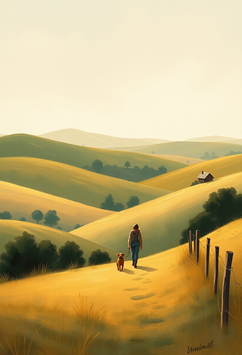 A quiet countryside scene with rolling hills, where a lone figure walks with their dog, painted in folk-art style but bathed indreamy, luminous colors. nostalgic folk-art storytelling, soft impressionistic brushwork, rolling countryside landscapes, gentle warm color palette, whimsical poetic atmosphere, handwritten text elements, dreamlike rural charm, sentimental and heartwarming composition