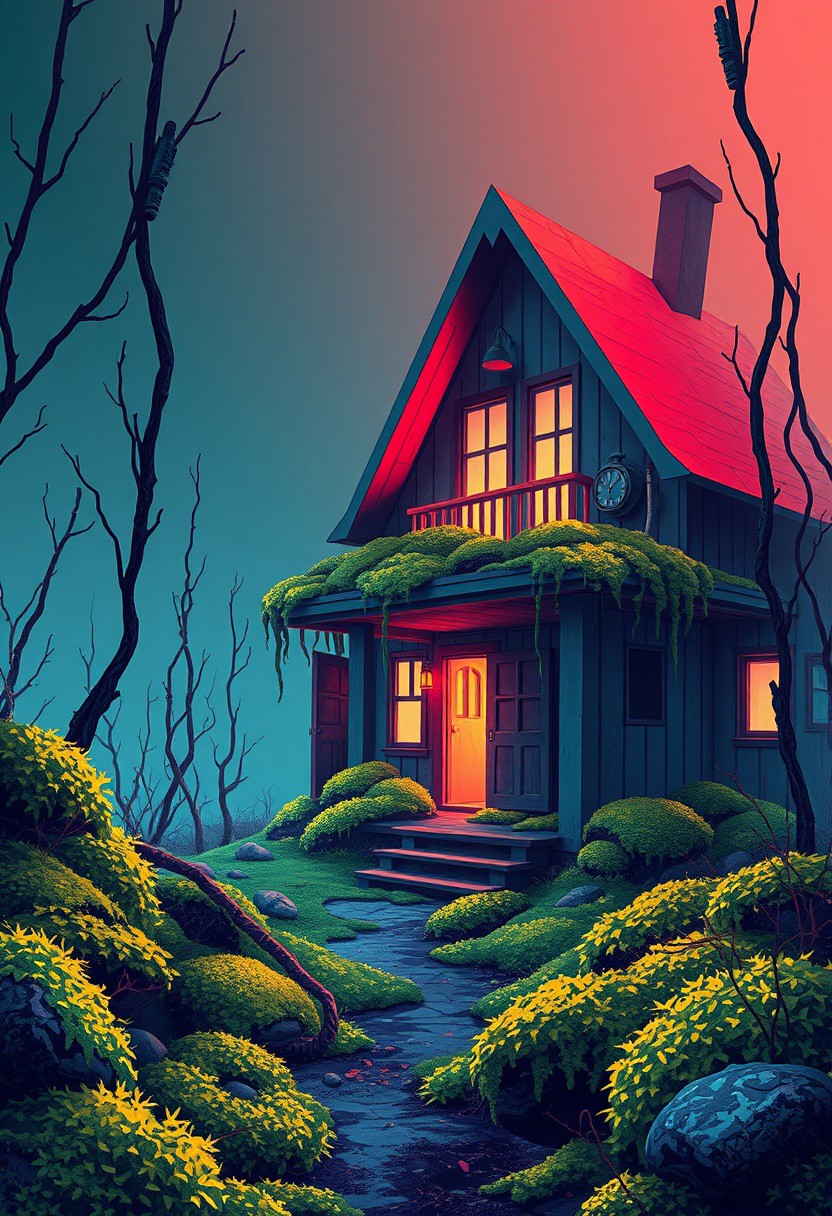 abandon house with moss everywhere, whimsical illustration, geometric abstraction, architectural precision, cyberpunk neon aesthetics, vibrant color palettes, clean lines, intricate detailing, atmospheric lighting, surreal minimalism, playful yet structured composition, cinematic mood, futuristic design, expressive forms, dreamlike storytelling, dynamic contrasts