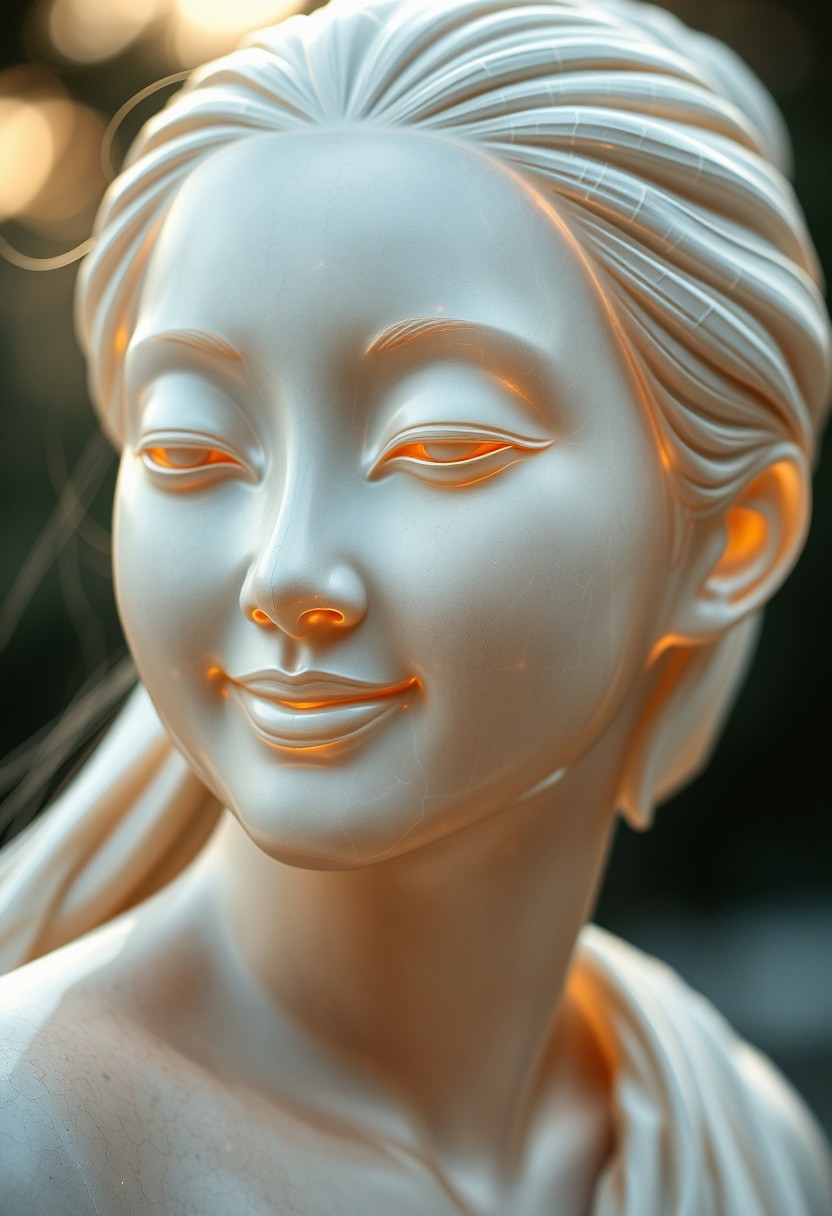 Close-up portrait of a statue of a an asian woman. Her head and body are semi-translucent, with numerous, glowing, fine, hairline cracks. A gentle breeze blows through her hair back as she turns her head slightly and stops to face the viewer. She blinks and then shyly smiles softly at the viewer.