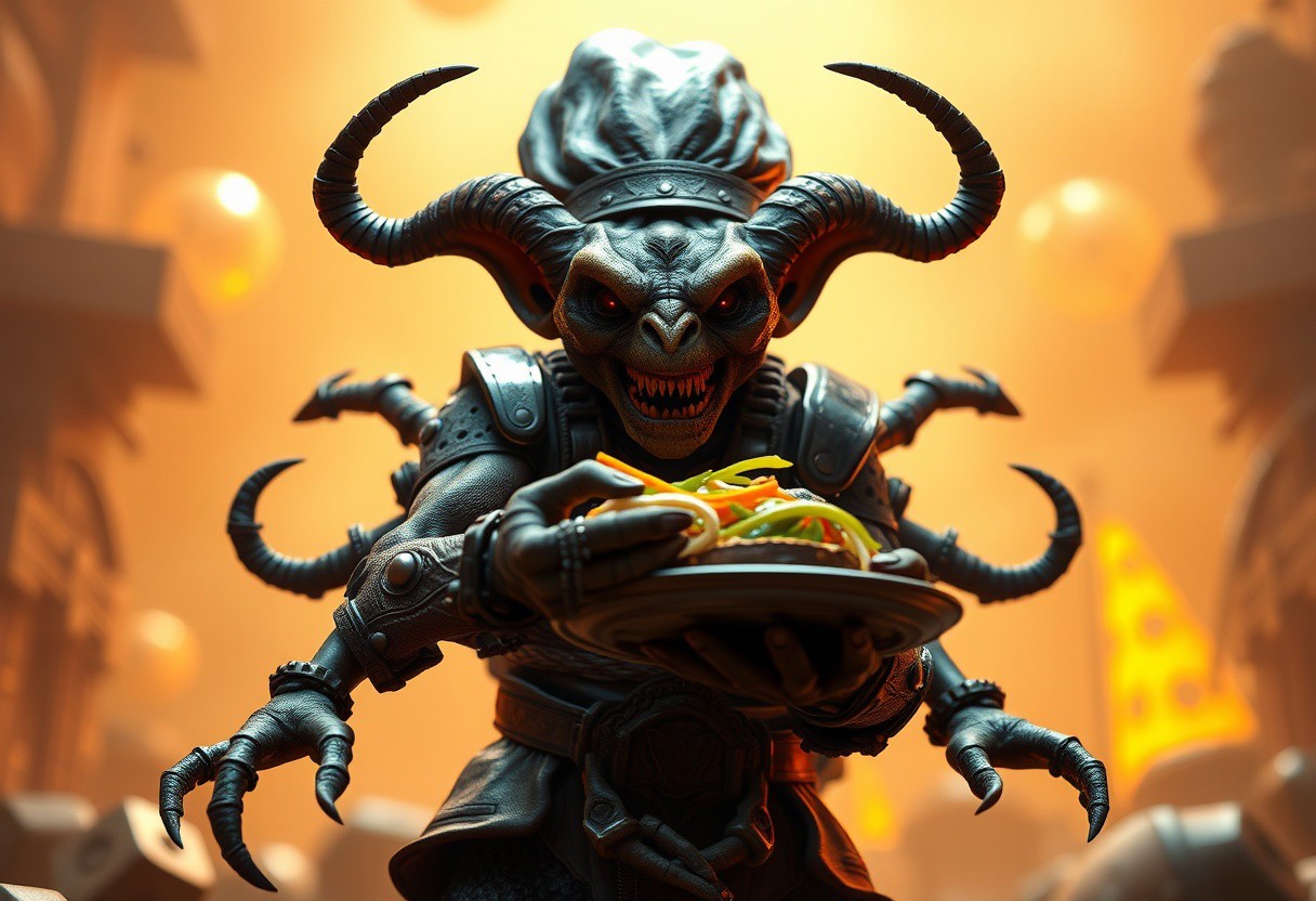 a close up of a goblin chainwalker on a Dice Dungeon background,best chef goblin chainwalker, best chef, for ps5, official image, infernal nymph!!!, orange color tone, extra limbs, fine image details, offering a plate of food, mma, watermeloncore, listing image, featured on amiami magazine, sattelbulb 3 d, rendered in blender, octane rendered in octane, 8 k, zbrush, unreal engine 5, extremely detailed and intricate, concept art, unreal engine 5, daz, hd wallpaper, epic composition, realistic concept art, ambient light, lovely and elegant scenery, full body, dynamic volumetric close up of a goblin chainwalker on a Dice Dungeon background,best chef goblin chainwalker, best chef, for ps5, official image, infernal nymph!!!, orange color tone, extra limbs, fine image details, offering a plate of food, mma, watermeloncore, listing image, featured on amiami magazine, realistic!!!!! grainy, backlit, elegant