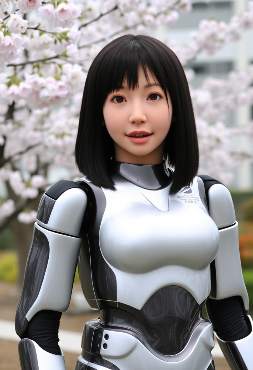 dynamic realistic photography,ultra sharp image,,super model,idol chinese 20 years old cute hot girl hrp4c robot ,big sister,black short hair,full body pose,narrow waist and large spherical breast, HRP 4C Robot Android woman, Japanese young woman human head, robot body, breast, human artificial skin, long black shoulder length bob hair, black coller neck, white silver and black colored body, cute face, the face of a young Japanese woman, big eyes, lips like a young woman, robotic arms, robotic leges, slender waist, sakura tree, graden, close shot , sports ,no hat, legapart ,4k,8k, hrp4c_robot, <lora:hrp4c_robot_v4.1:1>