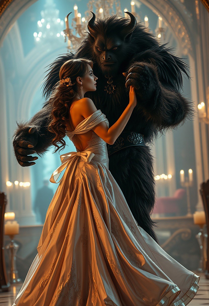 urban-fantasy Angel high-fashion stylish romance novel, photorealistic, masterpiece, best quality, detailed, full-length, full-body cinematic, dynamic lighting, soft shadow, epic detailed indoor lavish castle landscape background, professional photography, depth of field, intricate, detailed Silken shadows dance, at Venice ball: a sexy sultry most beautiful woman on earth in an off-shoulder ballgown is dancing with a towering muscular handsome fearsome furry beast, whispering secrets unseen, soft embrace of ball room. fantasy, breathtaking couple, background at a distance is an elegant ball room, beauty and beast, Labyrinth, Jareth and Sarah, dreamlike, surrealism, sharp focus, studio photo, intricate details, highly detailed, decadence. fog, a masterpiece, award winning, iridescent, gold, bright, pastels, candles, chandelier, marble, Disney's Beast, Belle, Beauty-and-the-beast, Disney