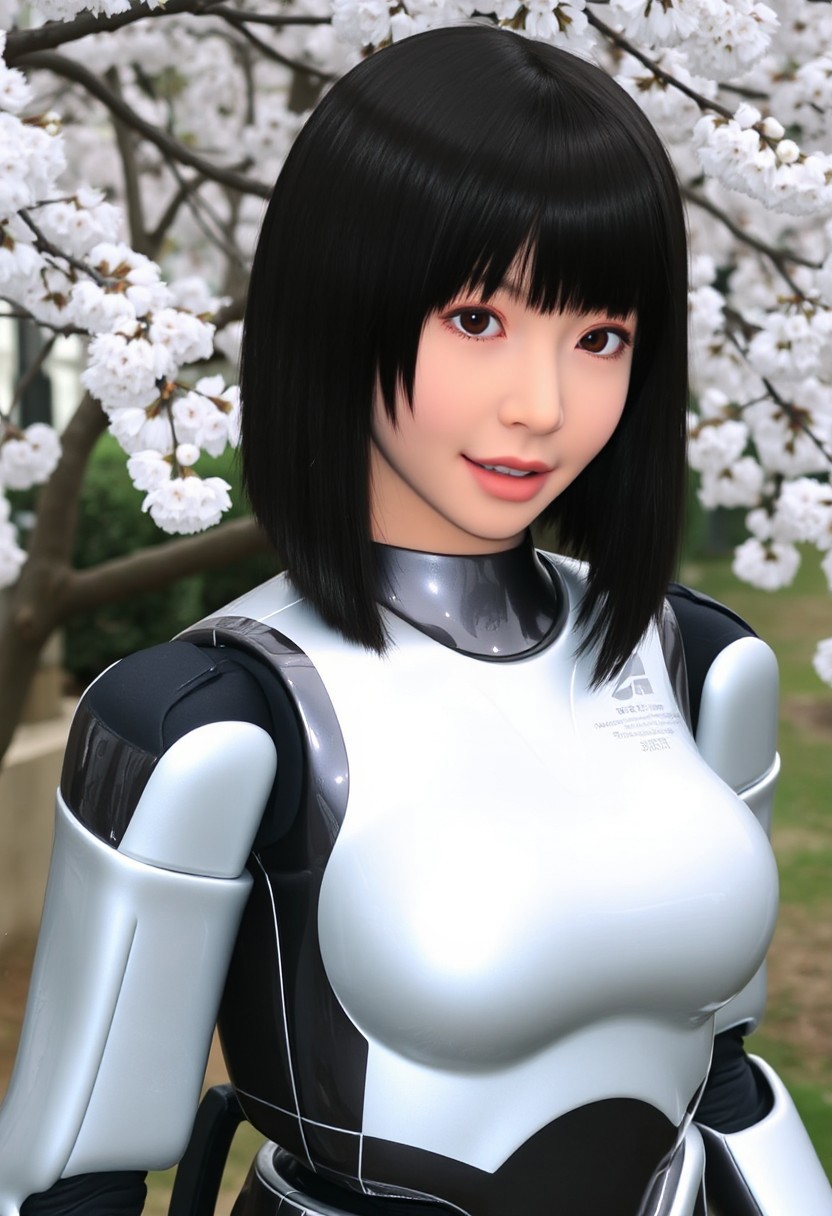 dynamic realistic photography,ultra sharp image,,super model,idol chinese 20 years old cute hot girl hrp4c robot ,big sister,black short hair,full body pose,narrow waist and large spherical breast, HRP 4C Robot Android woman, Japanese young woman human head, robot body, breast, human artificial skin, long black shoulder length bob hair, black coller neck, white silver and black colored body, cute face, the face of a young Japanese woman, big eyes, lips like a young woman, robotic arms, robotic leges, slender waist, sakura tree, graden, close shot , sports ,no hat, legapart ,4k,8k, hrp4c_robot, <lora:hrp4c_robot_v4.1:1>