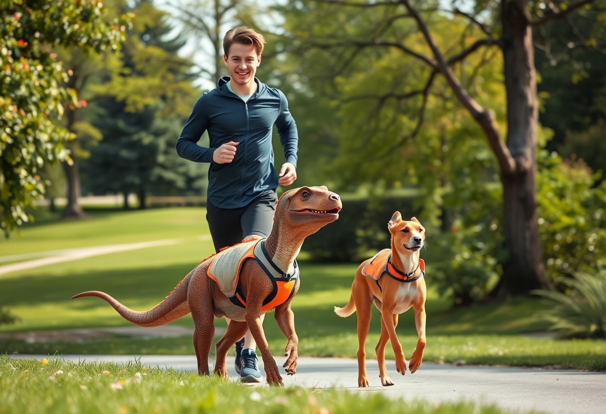 Summer, a beautiful park, a young man in athletic wear jogging alongside his pet dinosaur and a borzoi. The dinosaur and the dog are dressed in sporty dog vests, with the dinosaur being the same height as the dog, creating a whimsical and playful scene.