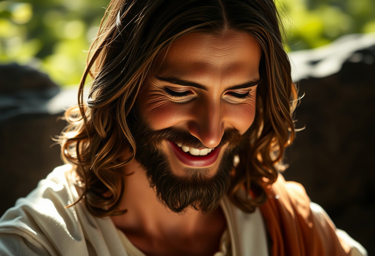Smiling Jesus, deep shadows, bright rays of light, Macro,32 ad, bright white linen robe, dark stone, green blurred background