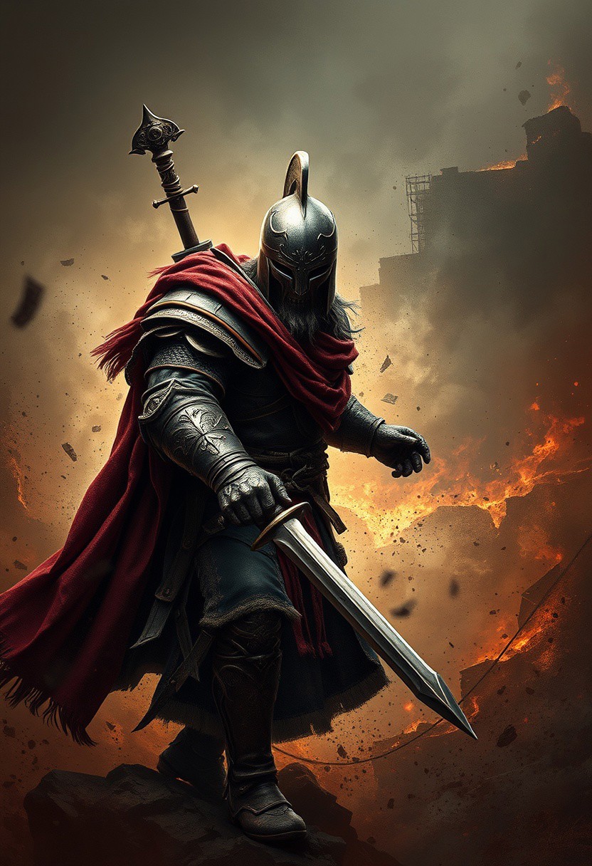 epic warrior, war torn background, epic quality