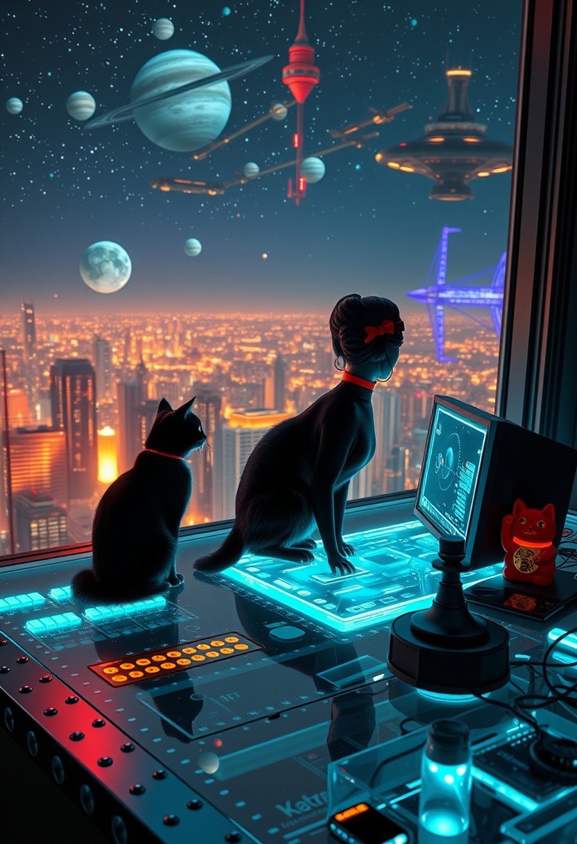 A sleek black cat with red collar sits on a cluttered metal riveted desk with transparent top and micro-LED lighted computer components visible inside, On the desk are a maneki neko statue and a lava lamp, the Black Cat is looking out of a seamless and futuristic floor to ceiling window that looks out at the lights of enormous buildings and cities far below, (((a beautiful woman, 24 years old, is sitting at the desk working on a holographic computer that displays planets and space ships floating in the air in front of her, the cat is sitting on the desk and looking longingly out the window, the woman is dressed in an ornate elegant Art-Deco Chinese style dress. An enormous deco-cyberpunk starship with futuristic lighting and an enormous space station are visible in the background among the stars, The woman's hair is elegantly tied up with a ribbon. Artistic cyberpunk, dynamic perspective, (((overall architectural aesthetic is Art Deco Cyberpunk))). Epic image that elicits a feeling of wonder and awe, part of the interior is visible,