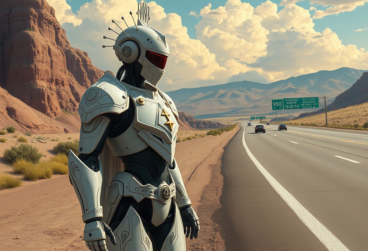 Create a high-quality, lifelike image of a robot adeptus astartes, inspired by the artwork of Alphonse Mucha, Greg Rutkowski, Loish, Rhads, Beeple, Makoto Shinkai, Lois van Baarle, Ilya Kuvshinov, Rossdraws, and Tom Bagshaw. The robot should be standing on the side of Highway 5, near Albuquerque, and should be dressed in modern, clean, white ornate cosplay armor. The armor should have a holy, celestial theme, with details inspired by the cleric class. The robot should be walking to work, with a hint of homelessness in its demeanor.
