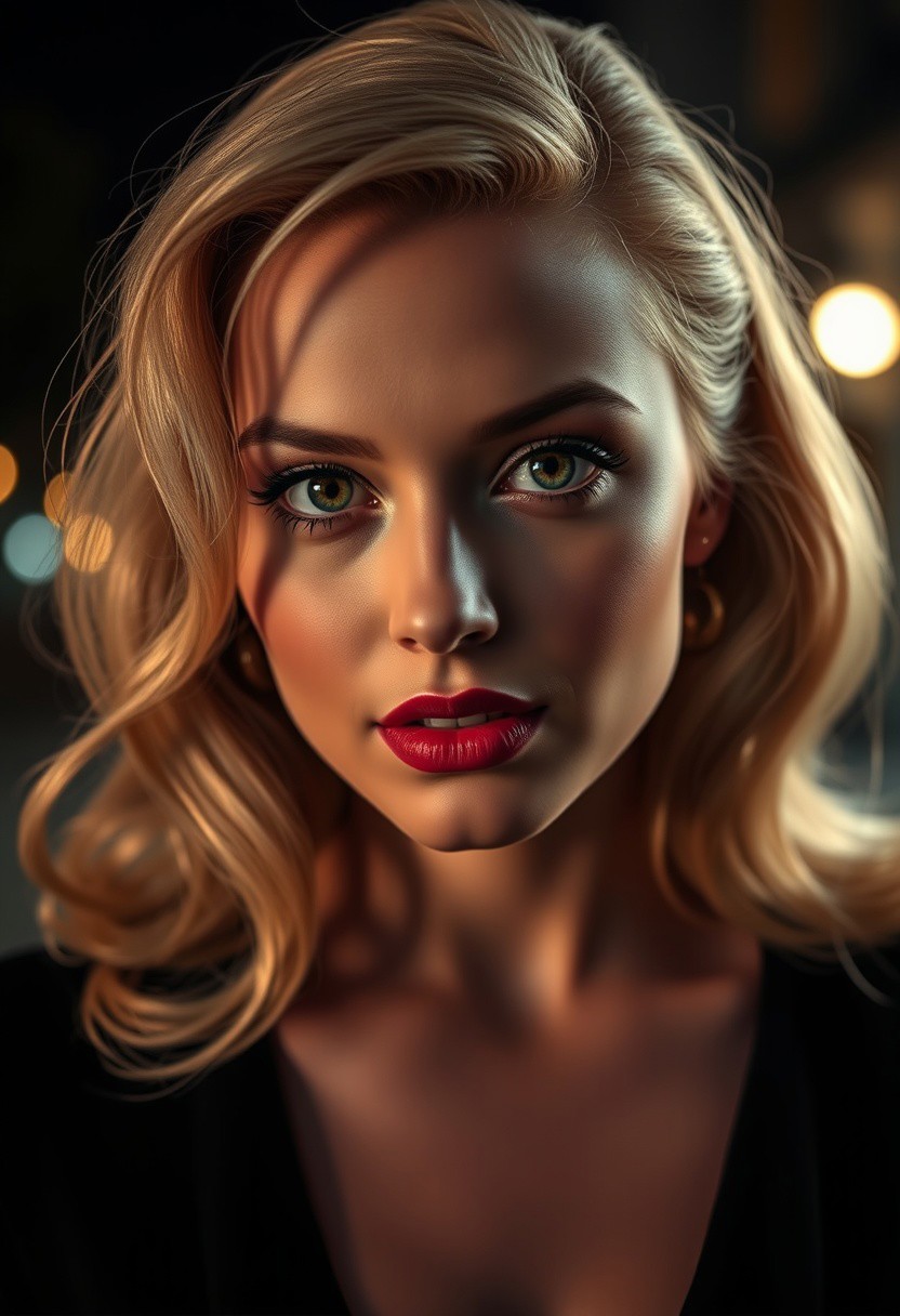 full body, 1 blonde Woman, 30 years old, beautiful, blonde hair, 40s style hairstyle, medium length hair, iluminacion artistica, no sombras, FACE: mujer rubia.ojos son grandes y expresivos, pestanas largas y oscuras que enmarcan un iris de color miel. Cejas finas y arqueadas . Su nariz es recta y delicada, y sus labios son carnosos y de un tono rosado natural. Un lunar sutil se encuentra cerca de su labio superior, anadiendo un toque de singularidad a su rostro. Su piel es de un tono melocoton suave, con un ligero rubor en las mejillas que sugiere calidez y vitalidad.. mirada sensual BACKGROUND:escena nocturna , , 1948,dormitorio antiguo ricamente adornado , tapices vivos colores y figuras. luminosidad artistica y ambiente intimo, mujer tumbada el estomago , en una cama antigua, , desnuda con perfectas mamas de tamano medio naturales, vientre perfecto, pubis afeitado, piernas esbeltas y estilizada estiradas, culo redondo perfecto calidad fotografica y artistica realistica, calidad fotografica realistica y artistica, , full body , vista lateral y superior, mirando a la camara