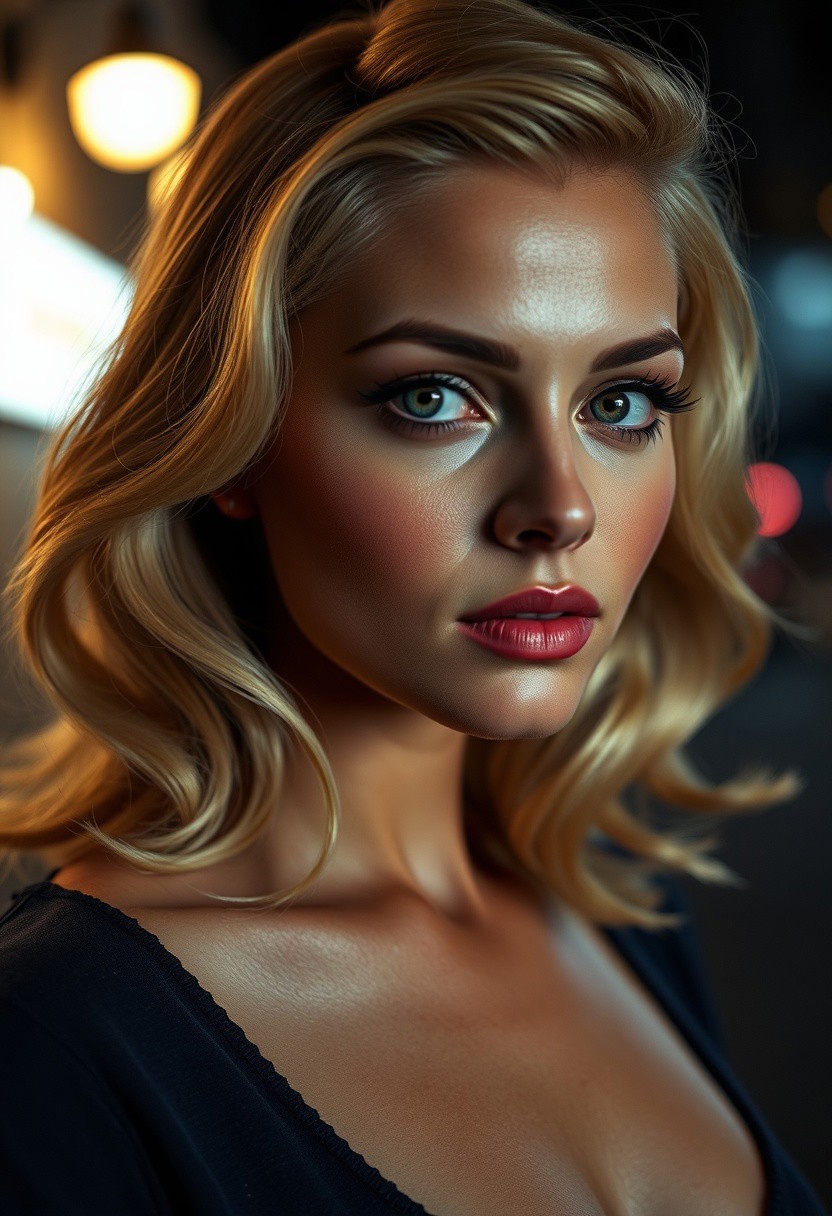 full body, 1 blonde Woman, 30 years old, beautiful, blonde hair, 40s style hairstyle, medium length hair, iluminacion artistica, no sombras, FACE: mujer rubia.ojos son grandes y expresivos, pestanas largas y oscuras que enmarcan un iris de color miel. Cejas finas y arqueadas . Su nariz es recta y delicada, y sus labios son carnosos y de un tono rosado natural. Un lunar sutil se encuentra cerca de su labio superior, anadiendo un toque de singularidad a su rostro. Su piel es de un tono melocoton suave, con un ligero rubor en las mejillas que sugiere calidez y vitalidad.. mirada sensual BACKGROUND:escena nocturna , , 1948,dormitorio antiguo ricamente adornado , tapices vivos colores y figuras. luminosidad artistica y ambiente intimo, mujer tumbada el estomago , en una cama antigua, , desnuda con perfectas mamas de tamano medio naturales, vientre perfecto, pubis afeitado, piernas esbeltas y estilizada estiradas, culo redondo perfecto calidad fotografica y artistica realistica, calidad fotografica realistica y artistica, , full body , vista lateral y superior, mirando a la camara