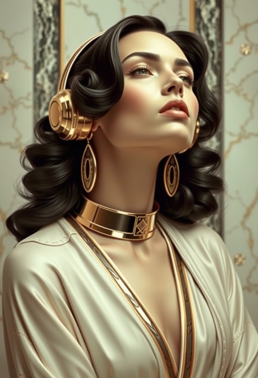 art deco woman 1970s retro-futurism , alabaster and marble , gold and chrome , flowing robes