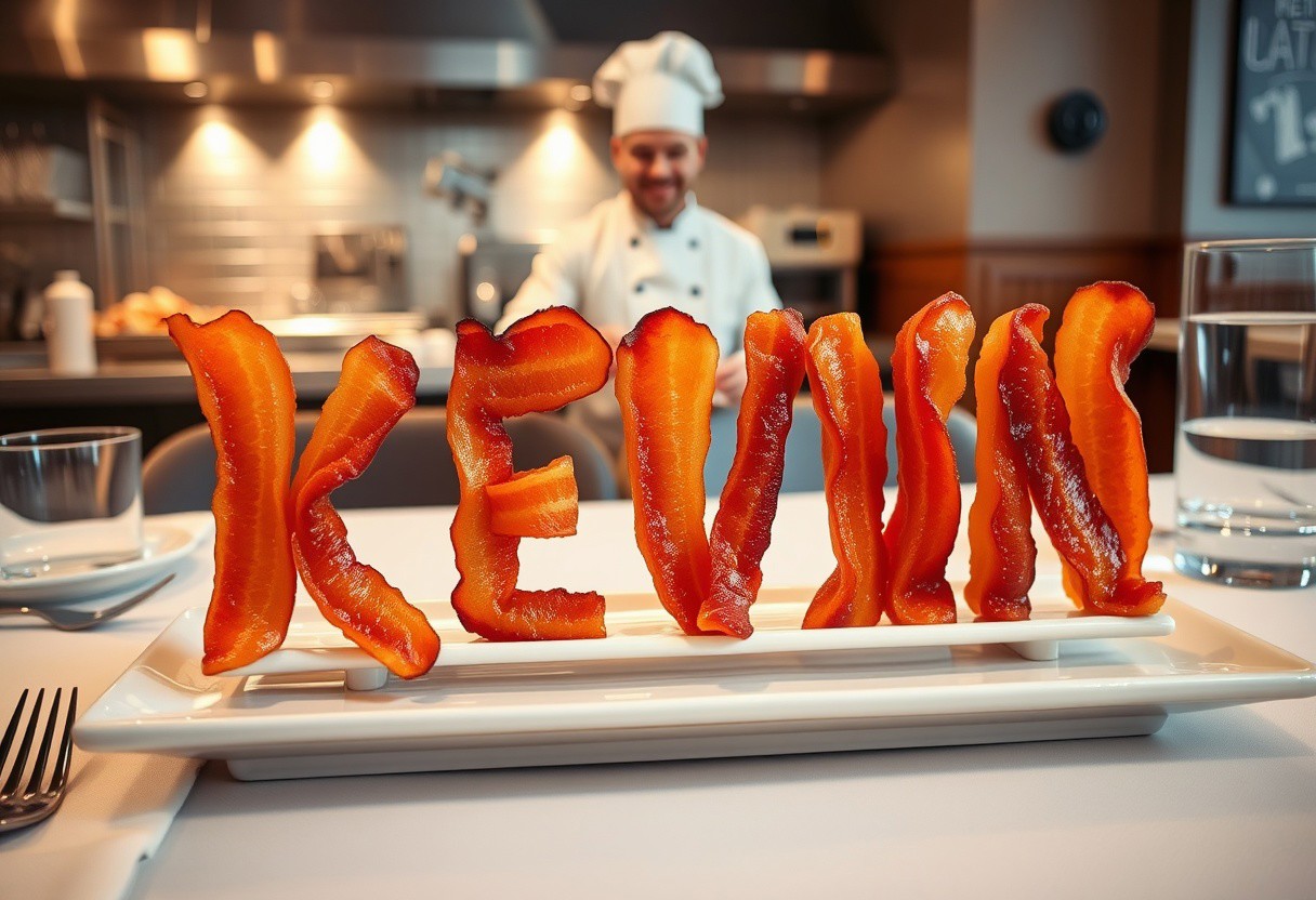 The name ‘KEVIN’ spelled out using crispy, golden-brown bacon strips, carefully arranged on a white ceramic plate. The plate sits on a restaurant table with a clean, stylish table setting—silverware, a napkin, and a glass of water nearby. In the background, a professional kitchen is visible, where Kevin, dressed as a chef in a classic white uniform and hat, is preparing more bacon with a confident smirk. The lighting is warm and inviting, capturing the delicious texture of the bacon and the lively restaurant atmosphere