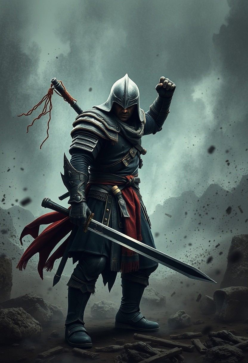 epic warrior, war torn background, defensive stance, epic quality, photorealistic, very realistic