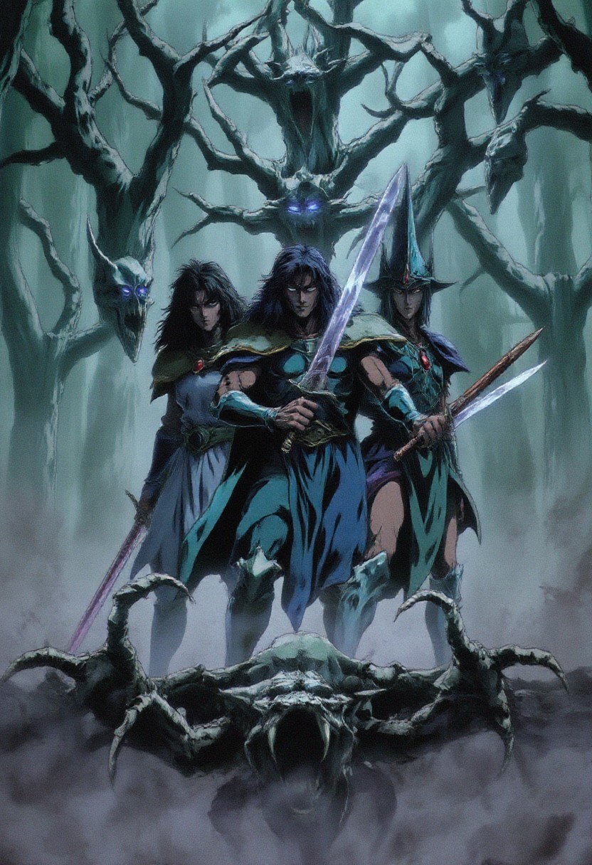 Three knights stand in a defensive formation within a misty forest. The leader, athletic with long, curly dark hair, wears detailed light armor and a cloak. To his right is a muscular warrior with a massive sword, behind him a slender mage with a glowing staff, and to his left a nimble rogue with twin daggers. They are surrounded by malevolent beings emerging from the dense fog and twisted trees. The Triocular Reapers, with their three glowing eyes, advance with paralyzing stares. Phantasmal Heads float around them, emitting haunting wails. Soulbound Trees twist their gnarled branches, their faces emerging from the bark. Nightshroud Stalkers blend into the shadows, while Wailing Wraiths glide silently with their chilling wails. Grim Spectres move with menacing grace, their skeletal hands reaching out. Gloomveil Fiends lurk in the darkness, Eclipsed Phantoms phase in and out of existence, leaving dark energy trails. Harbinger Terrors with skeletal frames advance slowly, and Wraithroot Spirits emerge from the ground with their vengeful eyes. The eerie atmosphere of the misty forest heightens the sense of danger and foreboding.