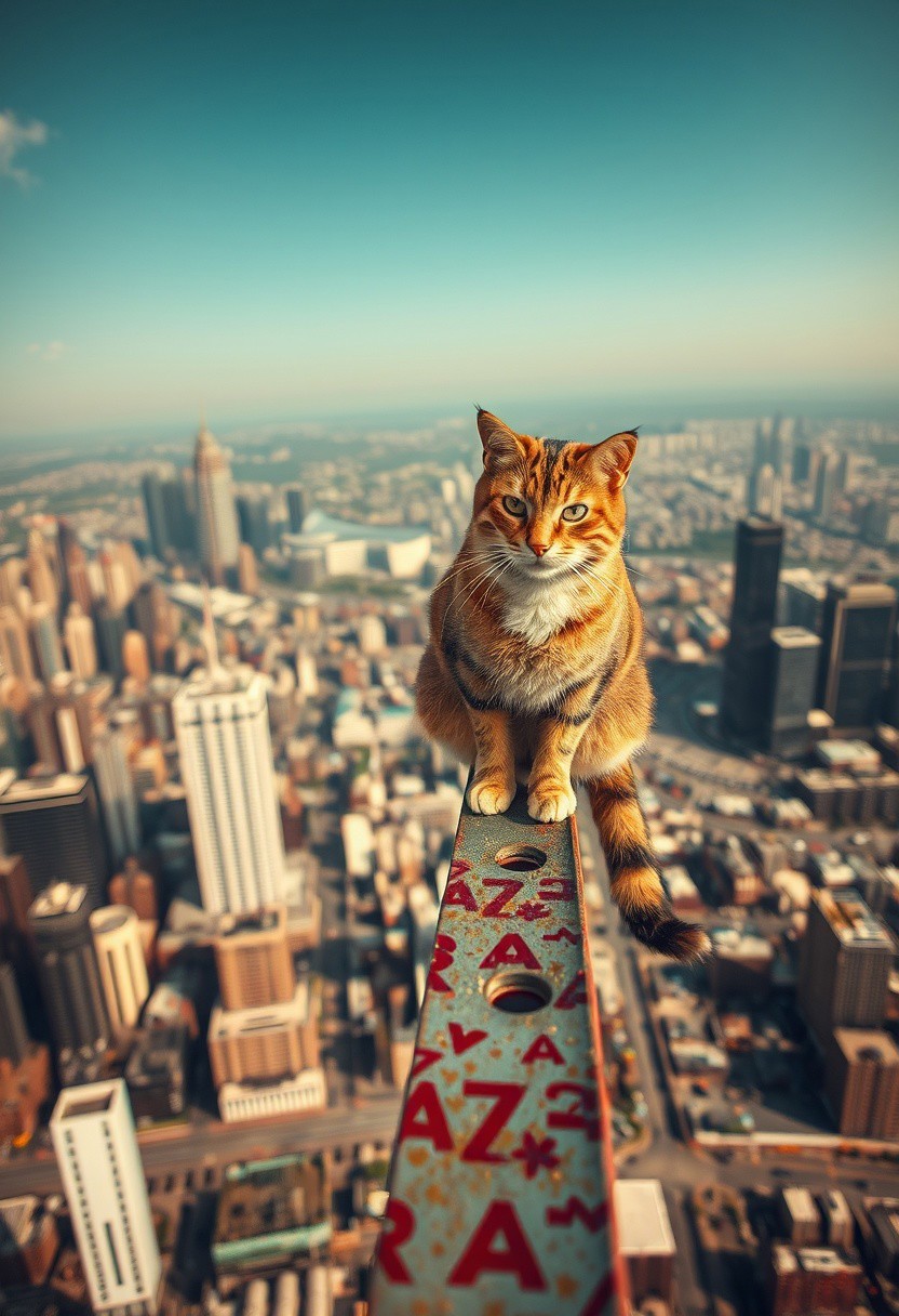(Soft Lighting Photography by Mimoza Veliu and Mario Giacomelli:1.2), NSFW, a cat sitting confidently on a steel beam high above a bustling cityscape. The cat is relaxed yet confident, with one leg dangling off the beam and the other bent, resting on the steel. The backdrop features a stunning aerial view of the city below, with skyscrapers and urban sprawl stretching into the horizon. The lighting is natural and golden, capturing the warmth of the sun reflecting off the steel and the soft haze of the city atmosphere. The image blends nostalgia with contemporary style, creating a striking and empowering visual.