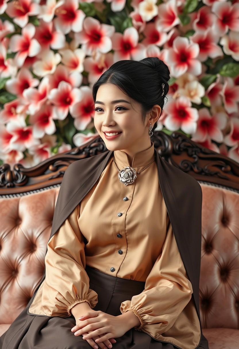 candid portrait photo of asian model, detailed eyes, detailed facial features, wearing a classic 1800s Victorian attire, long-sleeved Victorian era blouse with high neckline, cape, brooch and earrings. Her hair is neatly styled in a chignon bun. She is smiling and looking away from the camera. She is seated on a velvet Chesterfield design sofa, with deep tufted fabric design. The sofa has intricately carved wooden backs and legs with upholstered seats. Behind her is a pretty floral backdrop with lots of Hibiscus flowers. Photorealistic, shot on a Sony A7S III, 4k resolution, highly detailed textures. aidmafluxpro1.1