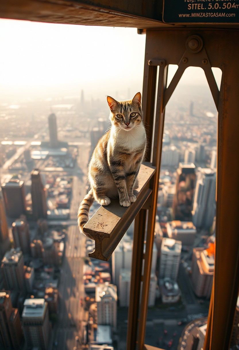 (Soft Lighting Photography by Mimoza Veliu and Mario Giacomelli:1.2), NSFW, a cat sitting confidently on a steel beam high above a bustling cityscape. The cat is relaxed yet confident, with one leg dangling off the beam and the other bent, resting on the steel. The backdrop features a stunning aerial view of the city below, with skyscrapers and urban sprawl stretching into the horizon. The lighting is natural and golden, capturing the warmth of the sun reflecting off the steel and the soft haze of the city atmosphere. The image blends nostalgia with contemporary style, creating a striking and empowering visual.