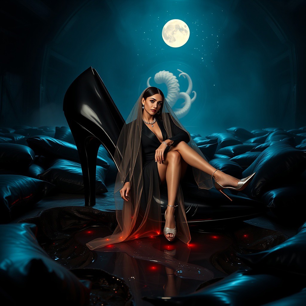 Elegant, refined woman in a sleek black business suit, enveloped in a thin, translucent slime film veil, adorning glimmering silver high heels, an elegant silver collar, and handcuffs, paired with exquisite diamond earrings, reclining on glossy black foil pillows within a gigantic, polished black high heel shoe, one knee elegantly bent, surrounded by an array of glossy, wet-look black pillows, bathed in the soft glow of dim light, set against the ominous backdrop of a dark, alien hangar, where a gaping hole in the floor overflows with a glossy, transparent slime, as menacing tentacles emerge from the shadows, shrouding the scene in an eerie, ominous fog, with a colossal, ancient dimension portal looming in the background, revealing a celestial expanse of stars and a glowing moon, evoking a horror cinematic film still, reminiscent of a shot captured on a v-raptor XL camera, imbued with a subtle film grain, vignette, and meticulous color grading, post-processed to perfection, with a cinematic lighting scheme, akin to a 35mm film, live-action masterpiece, characterized by an atmospheric, epic, and stunning visual narrative, replete with dramatic tension, in the style of H.R. Giger, Zdzisław Beksiński, and Simon Stalenhag.