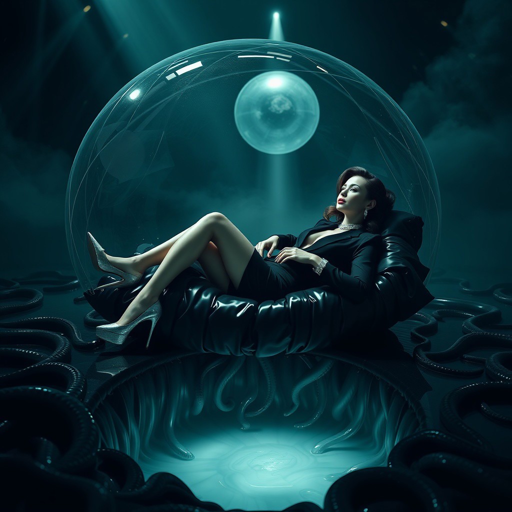 A refined, high-society woman, adorned in a tailored black business suit, shrouded in a thin, glistening slime film veil, accentuating her slender physique, reclines on a sumptuous, glossy black slime-covered pillow, her glimmering silver high heels and elegant silver collar and handcuffs radiating an air of opulence, complemented by dazzling diamond earrings. The woman is ensconced within a colossal, transparent jellyfish dome, surrounded by undulating tentacles, as a beam of dim, cinematic light casts an eerie glow, illuminating the dark, otherworldly alien hangar. A gaping hole in the floor, filled with a glossy, transparent slime, seems to stretch into the abyss, surrounded by a tangle of tentacles, as a thick, eerie fog wafts upward, shrouding the atmosphere. In the background, a colossal, ancient dimension portal yawns open, revealing a star-studded expanse, with a glowing moon suspended in the darkness. Inspired by the cinematic masterpieces of Ridley Scott, H.R. Giger, and Zdzisław Beksiński, this horror film still is shot on a virtual RED Raptor XL, with a deliberate, cinematic film grain, vignette, and color grading, evoking the nostalgic feel of 35mm film, with a live-action, atmospheric quality, imbuing the image with an epic, stunning, and dramatic sense of foreboding.