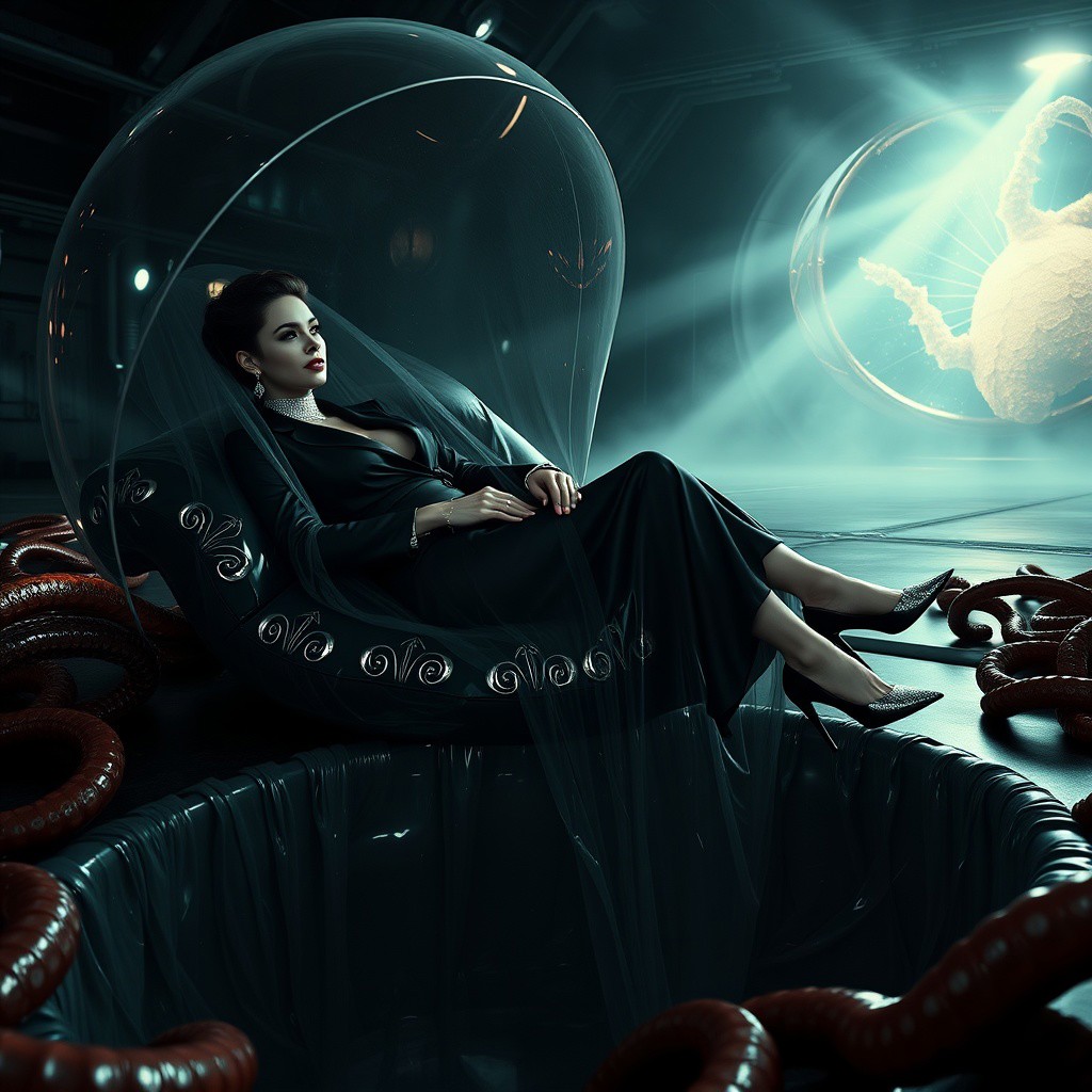 A refined, high-society woman, adorned in a tailored black business suit, shrouded in a thin, glistening slime film veil, accentuating her slender physique, reclines on a sumptuous, glossy black slime-covered pillow, her glimmering silver high heels and elegant silver collar and handcuffs radiating an air of opulence, complemented by dazzling diamond earrings. The woman is ensconced within a colossal, transparent jellyfish dome, surrounded by undulating tentacles, as a beam of dim, cinematic light casts an eerie glow, illuminating the dark, otherworldly alien hangar. A gaping hole in the floor, filled with a glossy, transparent slime, seems to stretch into the abyss, surrounded by a tangle of tentacles, as a thick, eerie fog wafts upward, shrouding the atmosphere. In the background, a colossal, ancient dimension portal yawns open, revealing a star-studded expanse, with a glowing moon suspended in the darkness. Inspired by the cinematic masterpieces of Ridley Scott, H.R. Giger, and Zdzisław Beksiński, this horror film still is shot on a virtual RED Raptor XL, with a deliberate, cinematic film grain, vignette, and color grading, evoking the nostalgic feel of 35mm film, with a live-action, atmospheric quality, imbuing the image with an epic, stunning, and dramatic sense of foreboding.