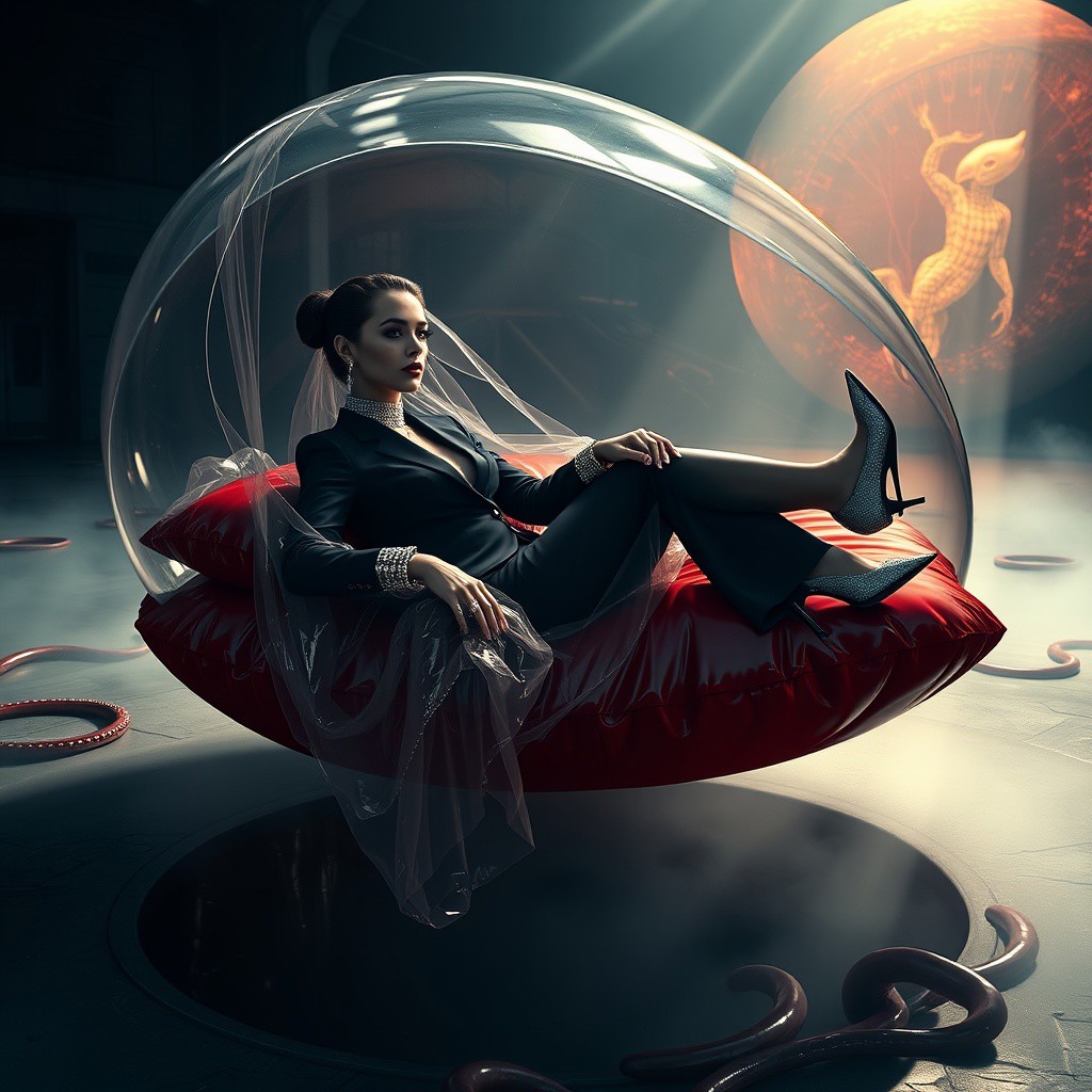 A refined, high-society woman, adorned in a tailored black business suit, shrouded in a thin, glistening slime film veil, accentuating her slender physique, reclines on a sumptuous, glossy dark red slime-covered pillow, her glimmering silver high heels and elegant silver collar and handcuffs radiating an air of opulence, complemented by dazzling diamond earrings. The woman is ensconced within a colossal, transparent jellyfish dome, surrounded by undulating tentacles, as a beam of dim, cinematic light casts an eerie glow, illuminating the dark, otherworldly alien hangar. A gaping hole in the floor, filled with a glossy, transparent slime, seems to stretch into the abyss, surrounded by a tangle of tentacles, as a thick, eerie fog wafts upward, shrouding the atmosphere. In the background, a colossal, ancient dimension portal yawns open, revealing a star-studded expanse, with a glowing moon suspended in the darkness. Inspired by the cinematic masterpieces of Ridley Scott, H.R. Giger, and Zdzisław Beksiński, this horror film still is shot on a virtual RED Raptor XL, with a deliberate, cinematic film grain, vignette, and color grading, evoking the nostalgic feel of 35mm film, with a live-action, atmospheric quality, imbuing the image with an epic, stunning, and dramatic sense of foreboding.