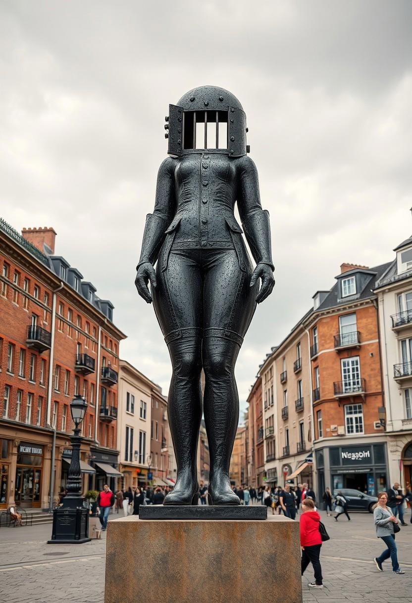 full height view, A full height heavily riveted steel closely-fitted iron casing shaped like a beautiful full height standing woman closely fitted to a trapped woman helplessly looking out through a barred opening on the front of the head, on a plinth in a town square