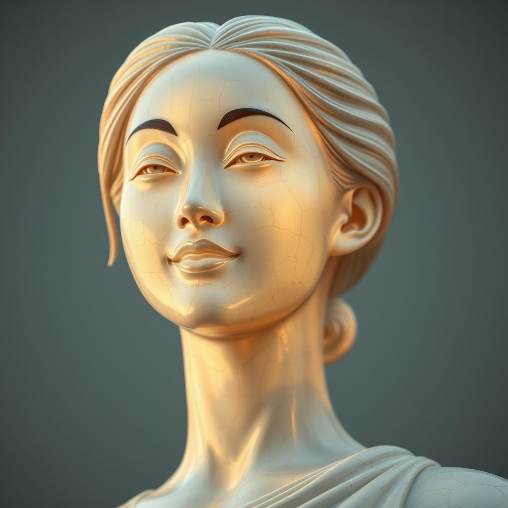 Close-up portrait of a statue of a an asian woman. Her head and body are semi-translucent, with numerous, glowing, fine, hairline cracks. A gentle breeze blows through her hair back as she turns her head slightly and stops to face the viewer. She blinks and then shyly smiles softly at the viewer.