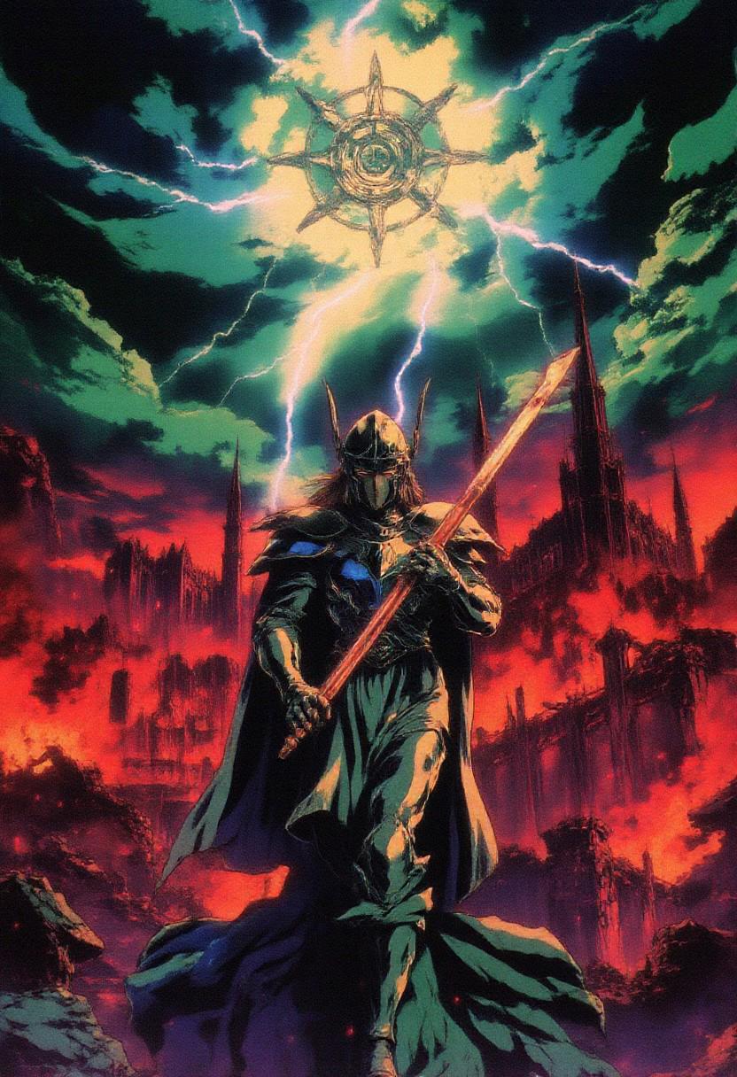 "Illustrate a brave knight rising amidst a chaotic and war-torn landscape. The sky is dark and foreboding, with ominous clouds swirling overhead and lightning crackling in the distance. In the foreground, the brave knight, clad in gleaming armor, stands tall and resolute. The background depicts a majestic kingdom in ruins, its towering spires crumbling and fires burning throughout the city. Ancient runes and symbols hover around the brave knight, hinting at a powerful prophecy and a perilous journey ahead. The scene should convey a sense of impending doom and the weight of the knight's destiny.