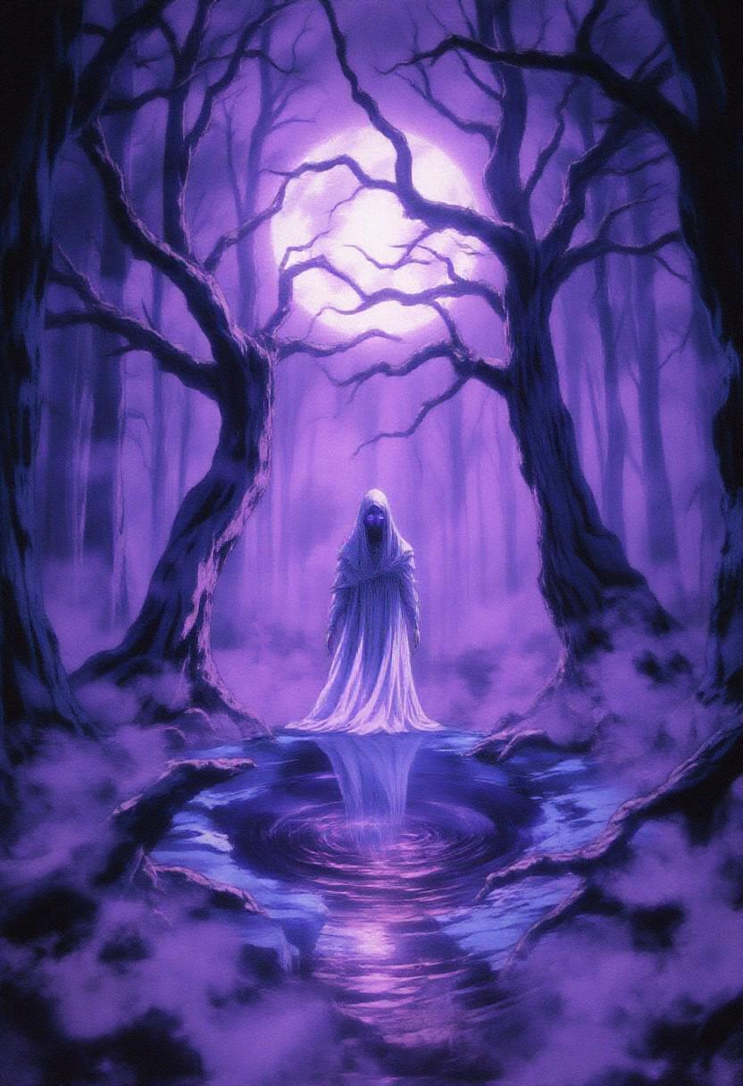 Create an image of a mystical forest enveloped in a thick, swirling mist. In the center of the scene, an ethereal oracle, draped in flowing, shimmering robes, stands at the edge of a sacred pool. The pool's surface reflects the moonlight and the oracle's glowing eyes, which emit an otherworldly light. Ancient trees with gnarled branches surround the pool, casting long, eerie shadows. The atmosphere is serene yet filled with a sense of anticipation, as if the forest itself is listening to the oracle's silent words