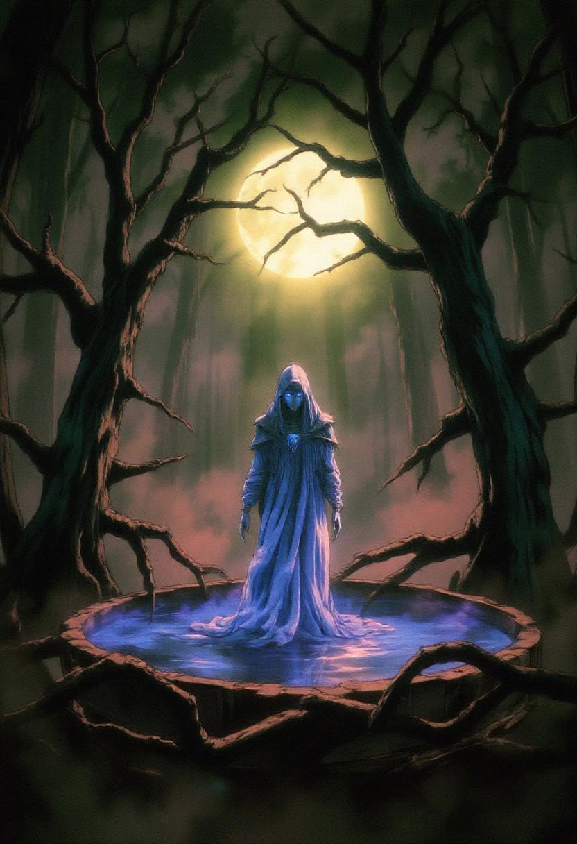 Create an image of a mystical forest enveloped in a thick, swirling mist. In the center of the scene, an ethereal oracle, draped in flowing, shimmering robes, stands at the edge of a sacred pool. The pool's surface reflects the moonlight and the oracle's glowing eyes, which emit an otherworldly light. Ancient trees with gnarled branches surround the pool, casting long, eerie shadows. The atmosphere is serene yet filled with a sense of anticipation, as if the forest itself is listening to the oracle's silent words