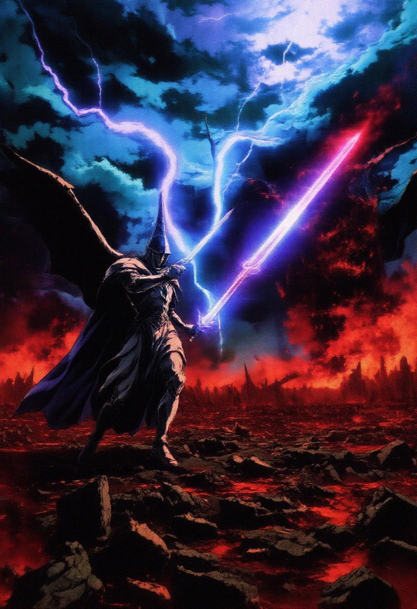 Create an image of a dark and desolate battlefield illuminated by violent flashes of dark magic and radiant light. The brave knight, armed with a sword that gleams with a brilliant, holy light, stands resolute and defiant. Opposite the knight is the Malevolent Harbinger, exuding a malevolent presence and wielding dark sorcery. The ground is scorched and littered with the remnants of previous battles. The sky is filled with swirling dark clouds and bolts of lightning. The scene captures the intensity of the epic battle, with the knight's light clashing against the Harbinger's darkness, creating a dramatic and visually striking contrast.