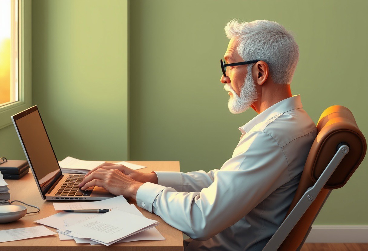 A highly detailed, semi-realistic 3D digital illustration, side view of a writer, sitting at his desk, typing on his laptop. The desk is positioned orthogonal to the window. The desk is cluttered with scattered sheets of paper and a sleek laptop, illuminated by the soft, warm glow of the golden hour at dusk. The writer's short white hair is combed back from his forehead, revealing a slightly receding hairline. A neatly groomed white beard, sideburns, and mustache frame his chiseled, narrow face with a strong jawline and prominent cheekbones. Thick, arched eyebrows sit above round, black-framed glasses on his sharp, narrow nose. His pale, healthy skin shows fine lines that reflect his experiences, with a slight rosiness in his cheeks. He wears a cozy, informal white shirt. He's chair looks foldable with a brown leather recline. The room is painted a calming light green, its walls bathed in the gentle, diffused light filtering through the window. The smooth, precise lines and clean shading emphasize the texture of the wooden desk and the subtle creases in the papers, creating a serene and focused atmosphere. The scene captures a moment of quiet productivity, blending natural light with the cozy interior setting. Hide