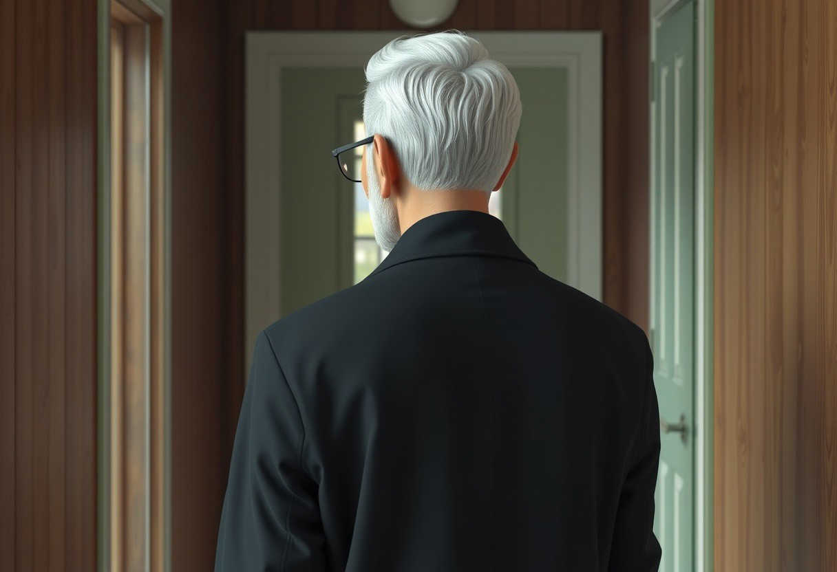 A highly detailed, realistic 3D digital illustration style, view of the back of an old writer exiting his home, going outside, the front door is in front of him. He's wearing black trenchcoat. The writer's short white hair is combed back, slightly receding hairline. From the side are visible his short white sideburns and beard, his chiseled, narrow face with a strong jawline and prominent cheekbones, and his black round glasses. The walls of his hallway are covered in wood, the concrete painted light green.