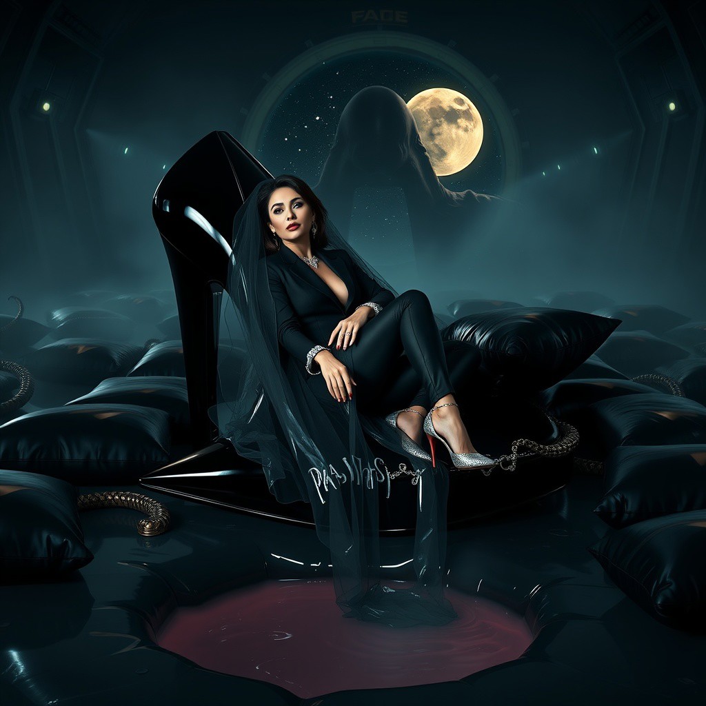 Elegant, refined woman in a sleek black business suit, enveloped in a thin, translucent slime film veil, adorning glimmering silver high heels, an elegant silver collar, and handcuffs, paired with exquisite diamond earrings, reclining on glossy black foil pillows within a gigantic, polished black high heel shoe, one knee elegantly bent, surrounded by an array of glossy, wet-look black pillows, bathed in the soft glow of dim light, set against the ominous backdrop of a dark, alien hangar, where a gaping hole in the floor overflows with a glossy, transparent slime, as menacing tentacles emerge from the shadows, shrouding the scene in an eerie, ominous fog, with a colossal, ancient dimension portal looming in the background, revealing a celestial expanse of stars and a glowing moon, evoking a horror cinematic film still, reminiscent of a shot captured on a v-raptor XL camera, imbued with a subtle film grain, vignette, and meticulous color grading, post-processed to perfection, with a cinematic lighting scheme, akin to a 35mm film, live-action masterpiece, characterized by an atmospheric, epic, and stunning visual narrative, replete with dramatic tension, in the style of H.R. Giger, Zdzisław Beksiński, and Simon Stalenhag.