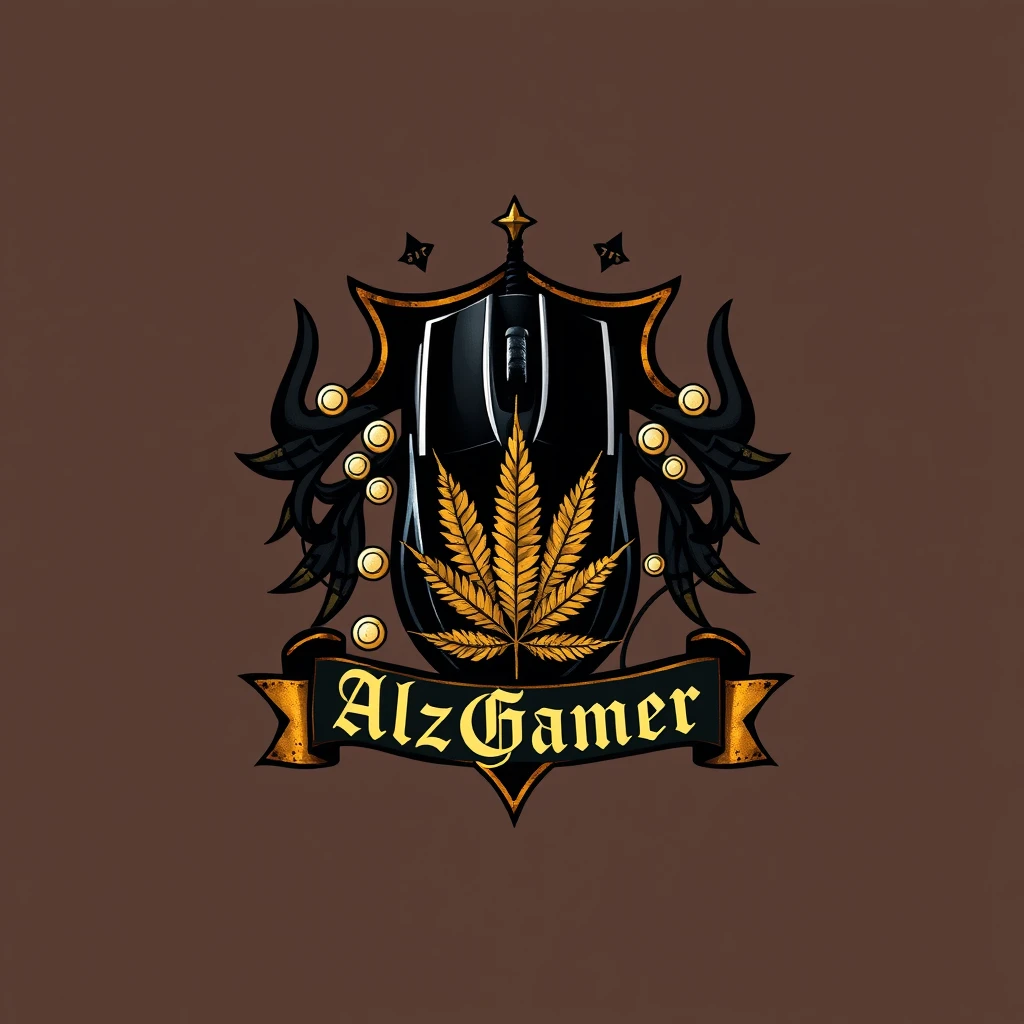 Stylish minimalistic logo, medieval heraldic (no crowns), inncludes computer mouse and lots of pills and label "AlzGamer" and marijuana leaf, oil painting, black and gold colours