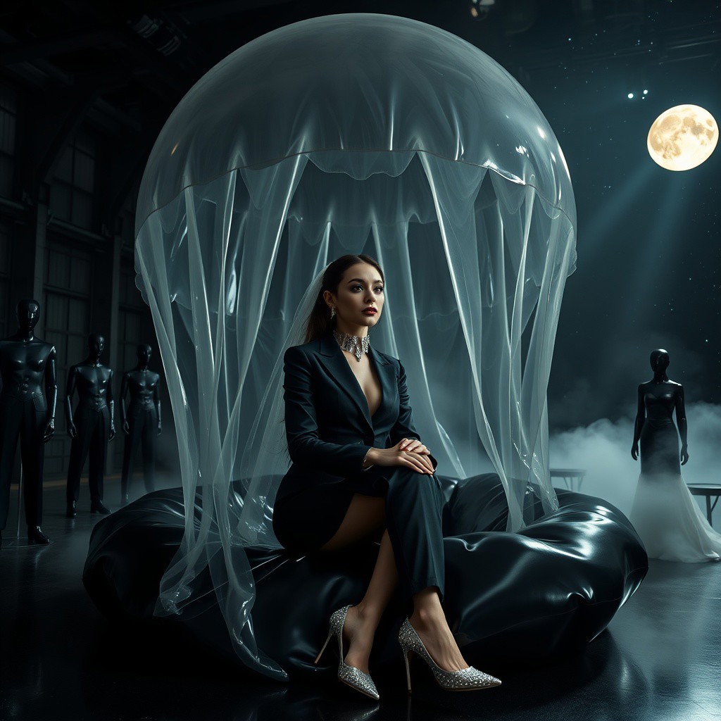 Elegant, refined woman in a sleek black business suit, enveloped in a thin, translucent slime film veil, adorning glimmering silver high heels, an elegant silver collar, and handcuffs, paired with exquisite diamond earrings, sit in a giant glossy black slime-filled pillow gaping hole, filled with transparent slime and assertive tentacles, covered by colossal, transparent jellyfish dome, eerie fog wafts upward, surrounded by evil tall black luxurious wedding gown mannequins. A beam of dim, cinematic light casts an eerie glow, illuminating the dark, otherworldly alien hangar. In the background, colossal, ancient dimension portal yawns open, revealing a star-studded expanse, with a glowing moon suspended in the darkness.