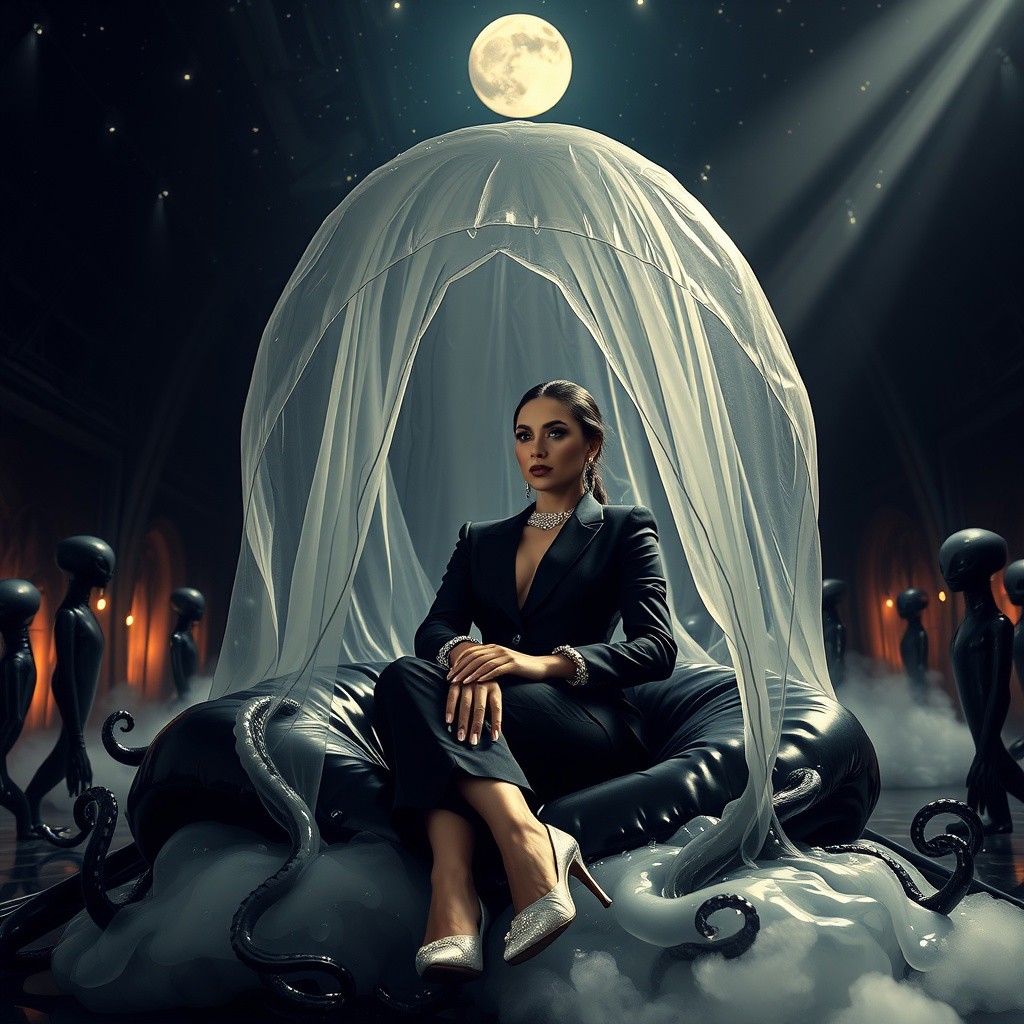 Elegant, refined woman in a sleek black business suit, enveloped in a thin, translucent slime film veil, adorning glimmering silver high heels, an elegant silver collar, and handcuffs, paired with exquisite diamond earrings, sit in a giant glossy black slime-filled pillow gaping hole, filled with transparent slime and assertive tentacles, covered by colossal, transparent jellyfish dome, eerie fog wafts upward, surrounded by evil tall black luxurious wedding gown mannequins. A beam of dim, cinematic light casts an eerie glow, illuminating the dark, otherworldly alien hangar. In the background, colossal, ancient dimension portal yawns open, revealing a star-studded expanse, with a glowing moon suspended in the darkness.